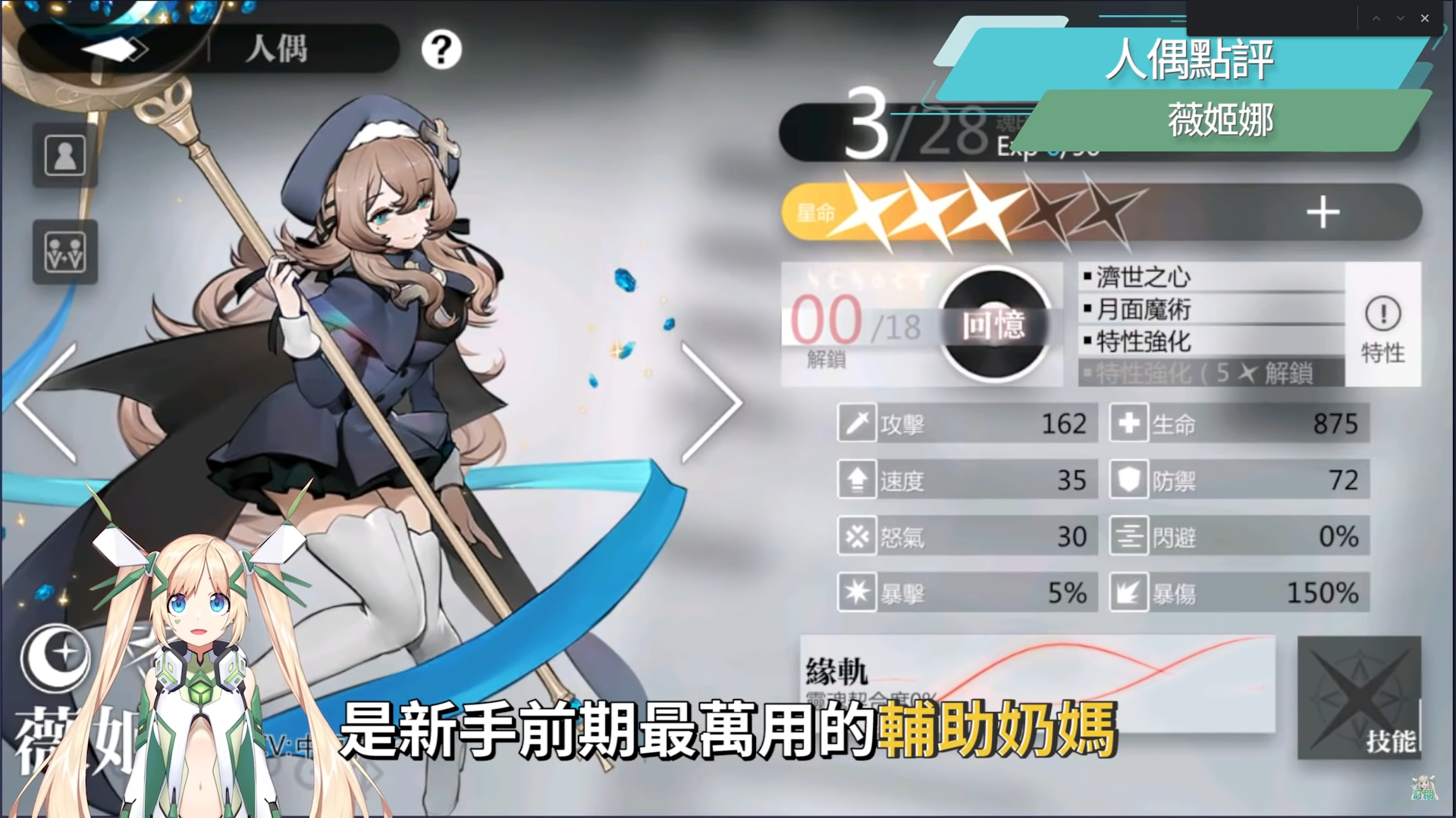 御五家中最婆的薇姬娜,是新手前期最萬用的輔助奶媽,第一組的治療魔法模組就有非常多實用的技能,包含2招回血、驅散、加攻等等,奧義的回血還會因為隊友的血量越低回復的血量越高,雖然群補是大多數情況下更為推薦的,但部分情況搭配群補放入薇姬娜也會為隊友帶來更安全的輸出環境,更甚至部分場合透過手動操作,還會比群補的人偶更好用。