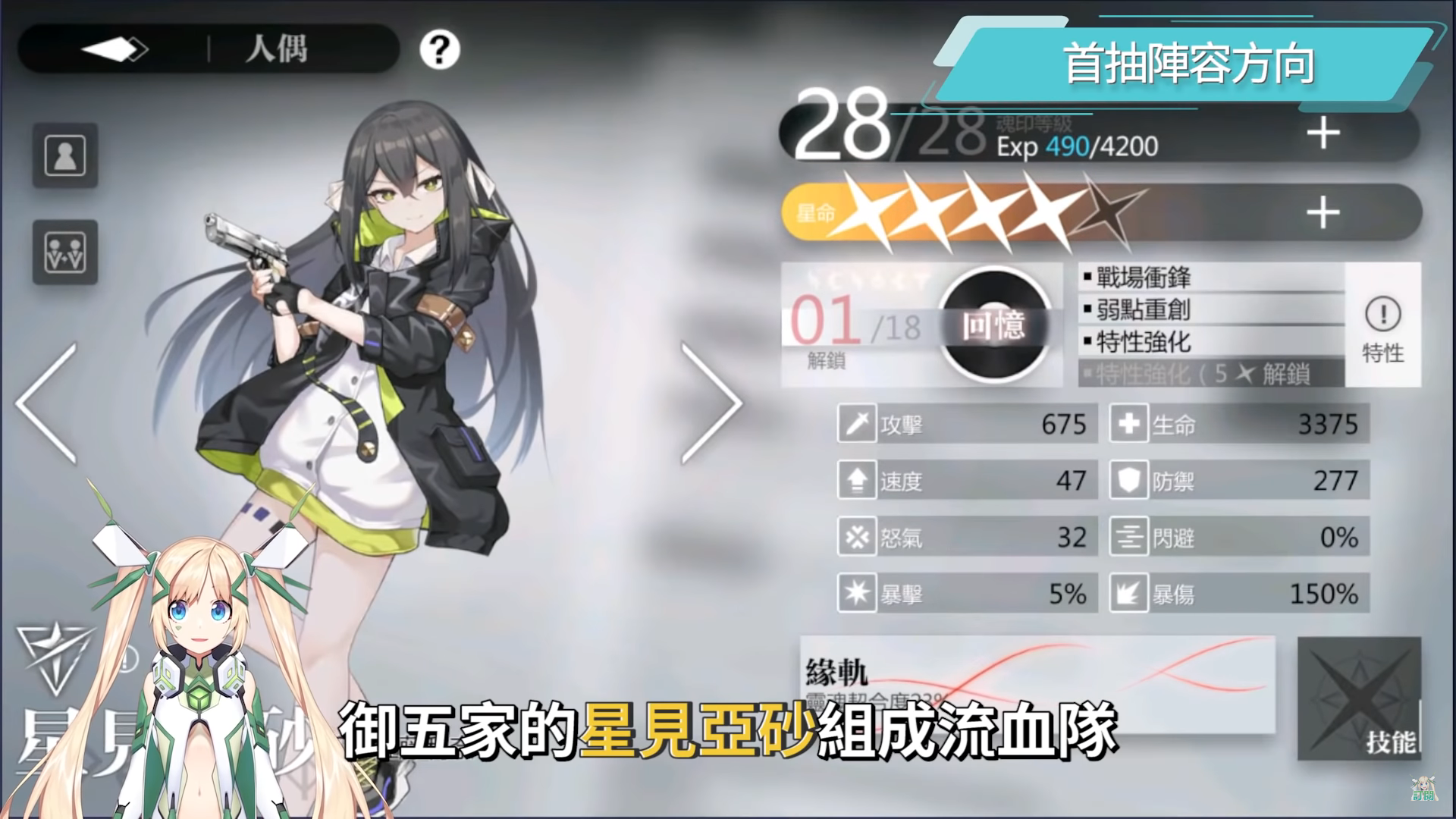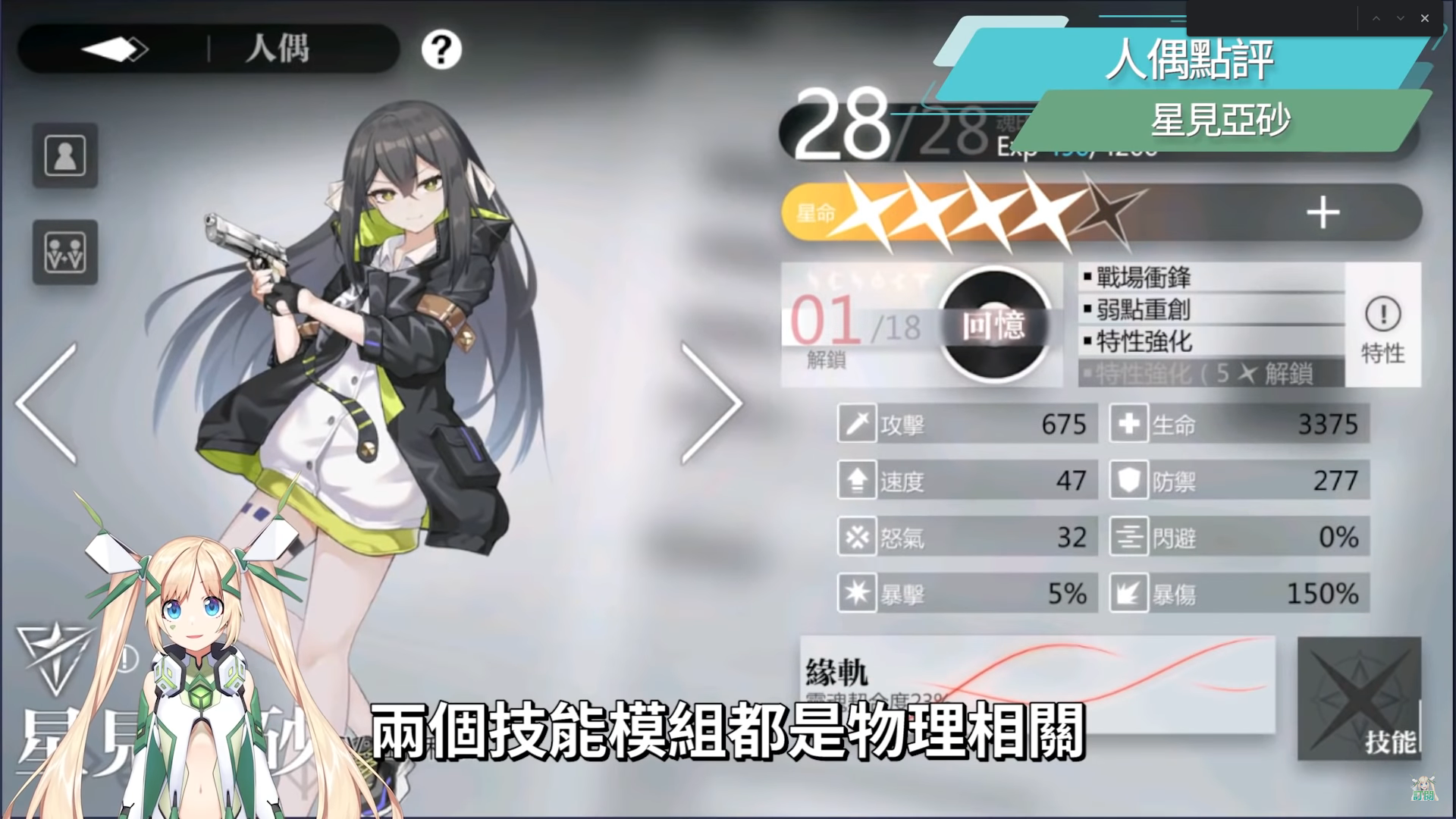 素材御五家的星見亞砂,兩個技能模組都是物理相關,只是一個是物理單體,技能組可以自加暴擊素材,奧義若造成暴擊還會無視敵人防禦,很容易打出高額傷害,並且在應對一些高防禦的BOSS時也可以直接破防進行直擊,另外一個則是物理流血,前期新手最好組的就是物理隊了,在還沒有組建成自己心目中的完美隊伍前,很多時候都是得靠亞砂帶你闖天下,說不定還會因為太常讓亞砂出場導致她不開心,加上亞砂的兩套技能模組都很實用,物理單體適合前期打物理暴擊,流血隊可以等湊到米涅德溫或是尼柯萊特再作其他流血隊的變化,流血之刃可以讓敵人受到的流血傷害增加,奧義兵刃術除了高額爆發外還可以附帶敵人破甲效果,後面應付世界BOSS時也都有亞砂實用的地方。