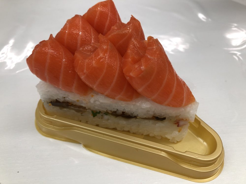 ▲三角形的鮭魚壽司蛋糕,蛋糕本體是用米飯做的!