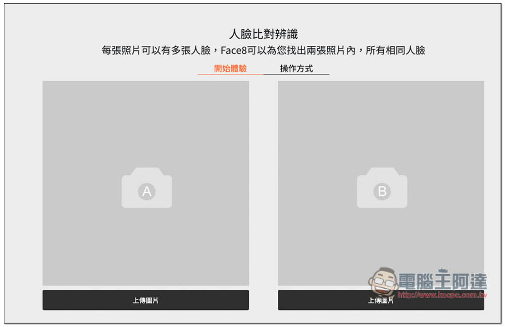 除了名人堂-臉部辨識外,PAPAGO! 還有提供另一個人臉比對辨識,可以辨識出兩張照片內,有出現相同的人臉的結果,有需要的人也能試試看。操作方式也很簡單,就左右上傳你要比對的照片: