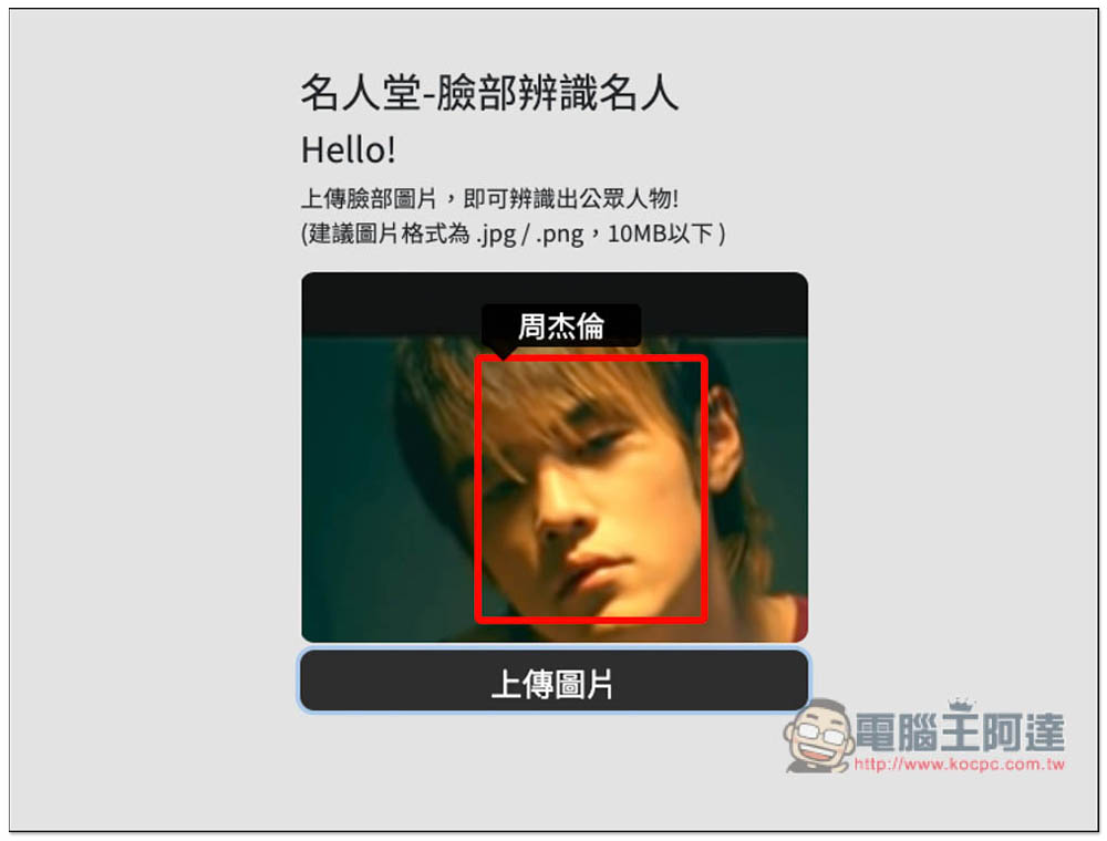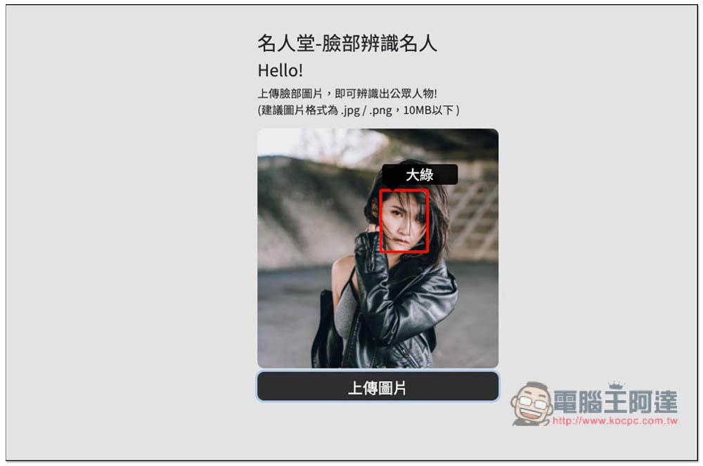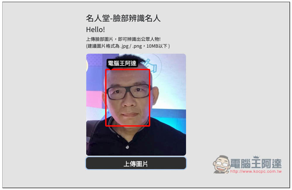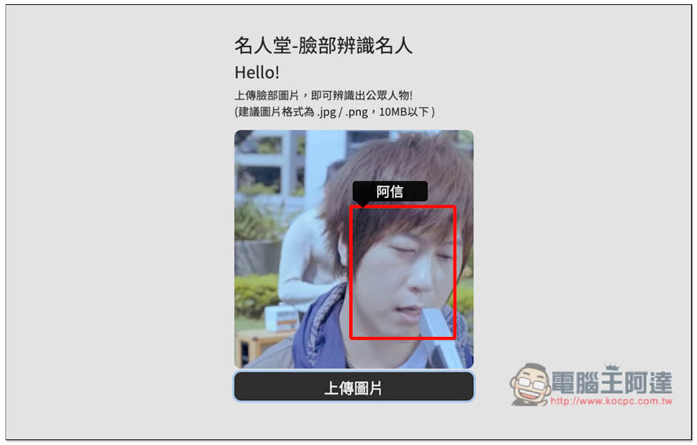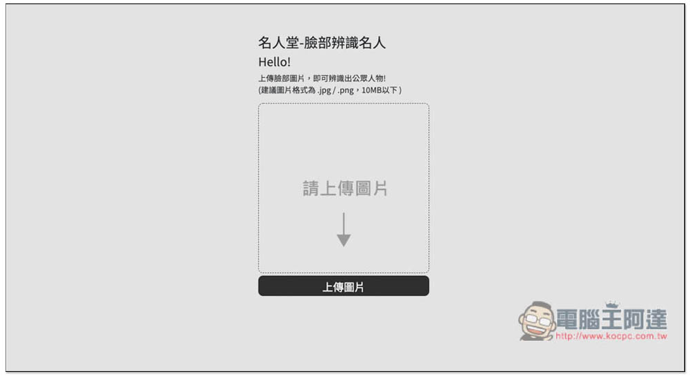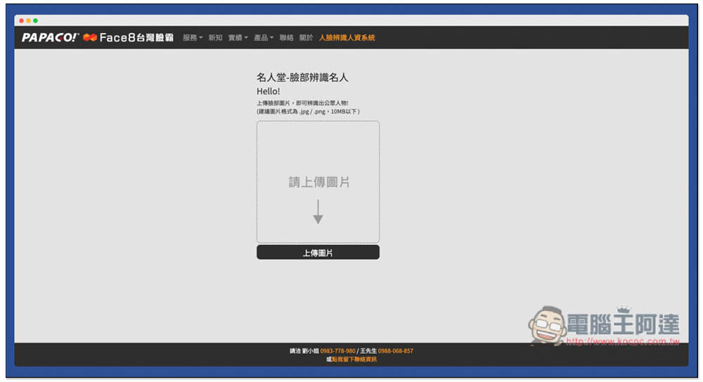 這個名人堂-臉部辨識名人線上工具是由台灣 PAPAGO! 所推出,使用方式很簡單,一進到網站之後就可以上傳你要辨識的圖片,唯一可惜是目前不支援拖曳功能,必須點擊上傳圖片手動選擇。一次只能辨識一張照片,還不提供多張功能。支援 .JPG 與 .PNG 兩種圖片格式,檔案大小必須在 10MB 以下:
