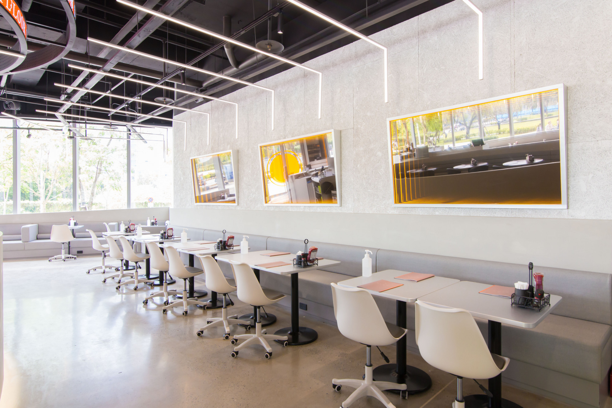 走進店內映入眼簾的是吸睛的跑馬燈轉盤,亮眼裝置設計令人眼睛一亮!!連店內放的歌單都是有點微夜店風的電音唷(笑)室內採用大量鍍鋅鋼板、工業風白燈條,從裡到外打造科技潮流前衛感。除此之外,餐桌椅更使用有輪子的「辦公桌椅」XD連這種小細節都不放過耶~~總坪數約70至80坪左右,席次將近100個座位,皆附插座供客人使用!(貼心無極限)