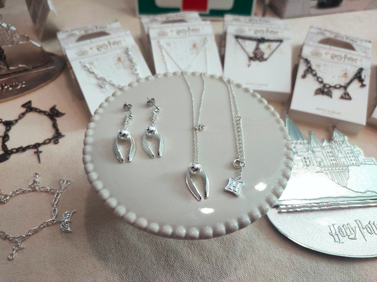 首先先來介紹飾品的部分~將《哈利波特》經典元素通通放進項鍊、首飾上,包括有魁地奇球場上最靈動的「金探子項鍊」與「金探子垂墜耳環」,還有妞編輯最喜歡的「圓框眼鏡鎖骨鍊」,超有神秘感的「學院創始者遺物手鍊」,更打造了「霍格華茲飾品收納盤」讓所有魔法師都能細心地擺上你們的項鍊,整體以低調簡約的精緻感製作,女孩們快來收集你的專屬護法道具吧。