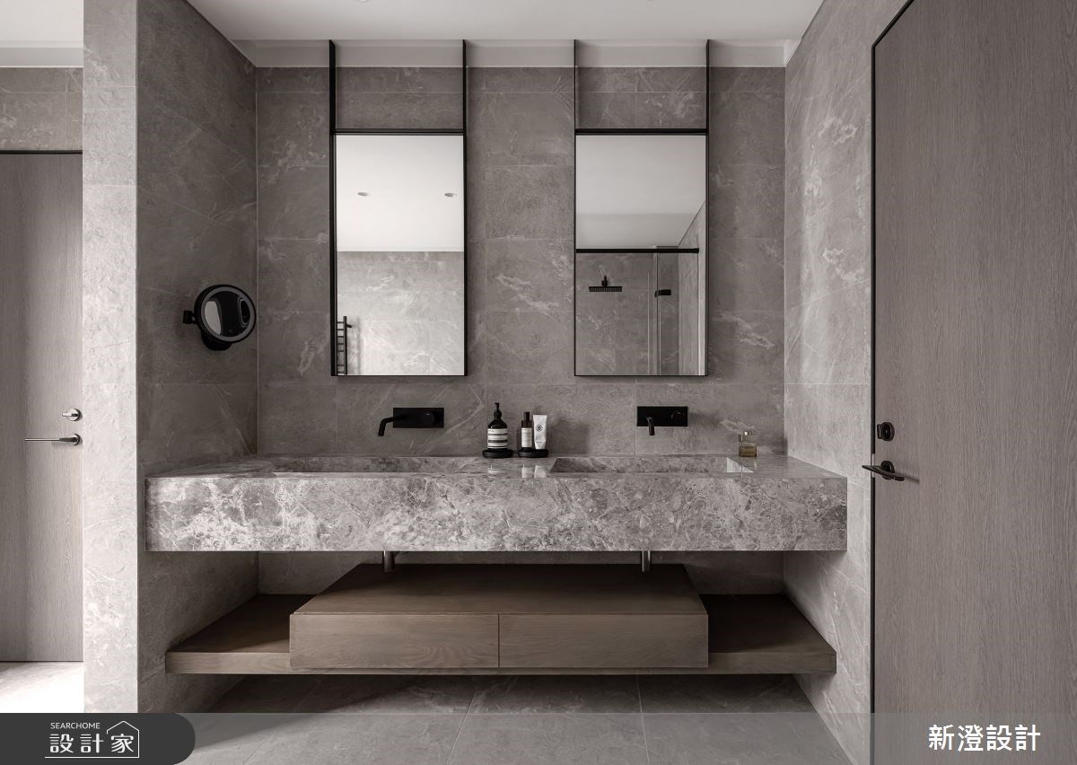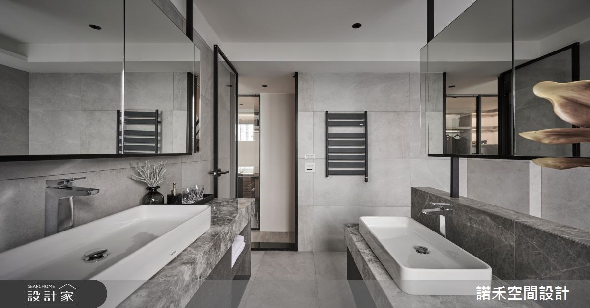 因為男女生理條件不同,很多情侶或夫妻可能會有較多的身高差距,規劃洗手台時究竟要配合哪一方的身高,便成為最大的設計難題。設計師以雙邊的洗手台設計,為屋主夫妻打造出友善的使用高度,此外,更搭配交錯的站位和環形的動線,讓盥洗習慣更加舒適流暢。