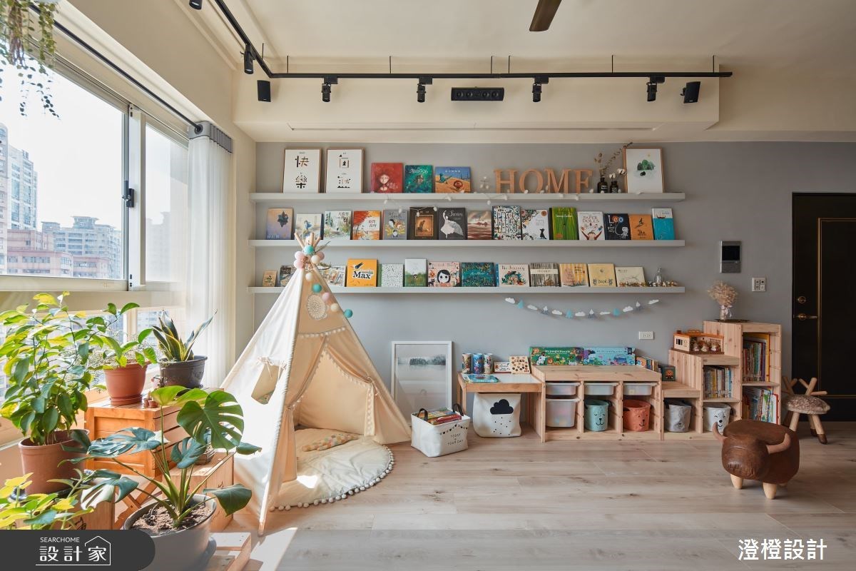 取代了制式的電視牆設計,打造出童書的展示區和投影布幕,讓生活聚焦在和孩子的快樂互動,設計師也加入了一座米色的民族風帳篷,和屋主喜愛的植栽綠意,即便不出門,也很有戶外的舒適自然氣息!