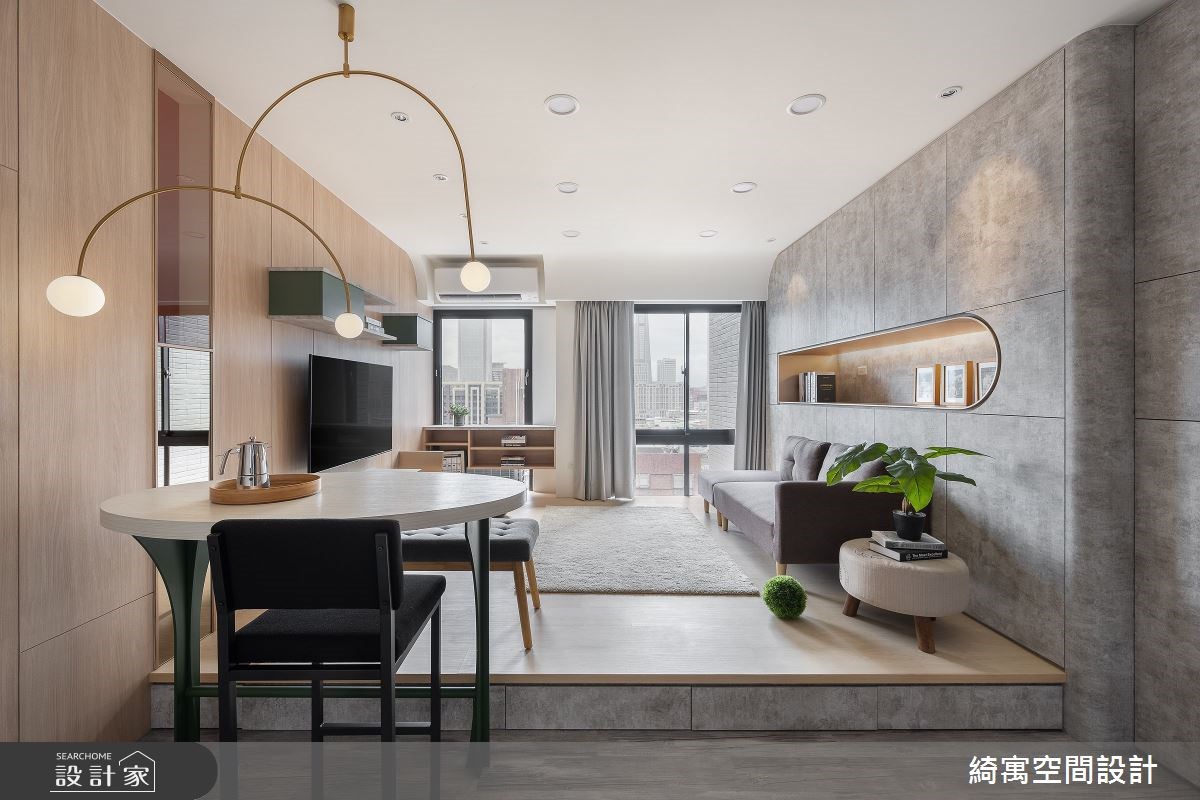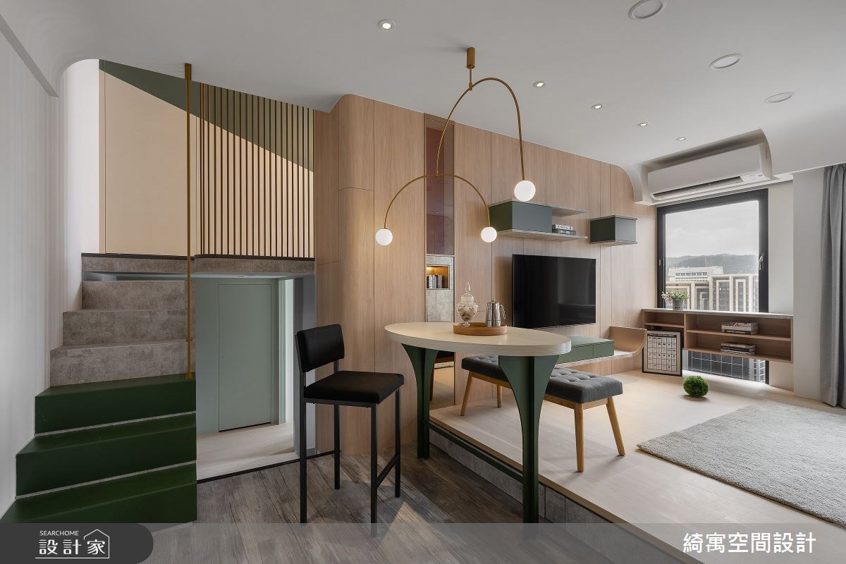 僅有18 坪的住宅,屋主為一對夫妻和活潑可愛的雙胞胎女兒,為了讓孩子擁有充裕的活動空間,設計師運用分散式收納的概念,以及高低差的場域分布,降低櫃體的存在感,打造出寬敞又舒適的親子客廳。