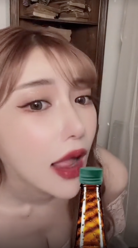 影片中,她穿著深V粉紅洋裝,薄紗讓深溝若隱若現,對著鏡頭前的酒瓶狂舔,讓粉絲都暴動了!