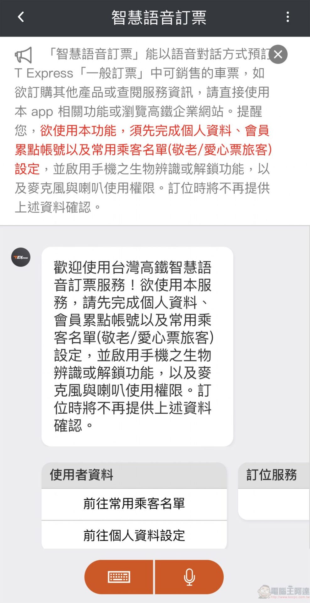 想使用「智慧語音訂票」,除了「T-EX行動購票」App須為 v6.30 以上版本,使用服務前須先完成 T Express 之「個人資料設定」(包含取票識別碼、會員累點帳號等),系統將直接帶入「個人資料設定」內之相關資訊完成訂位;同時亦須先啟用手機之生物辨識或解鎖功能,及麥克風與喇叭使用權限。
