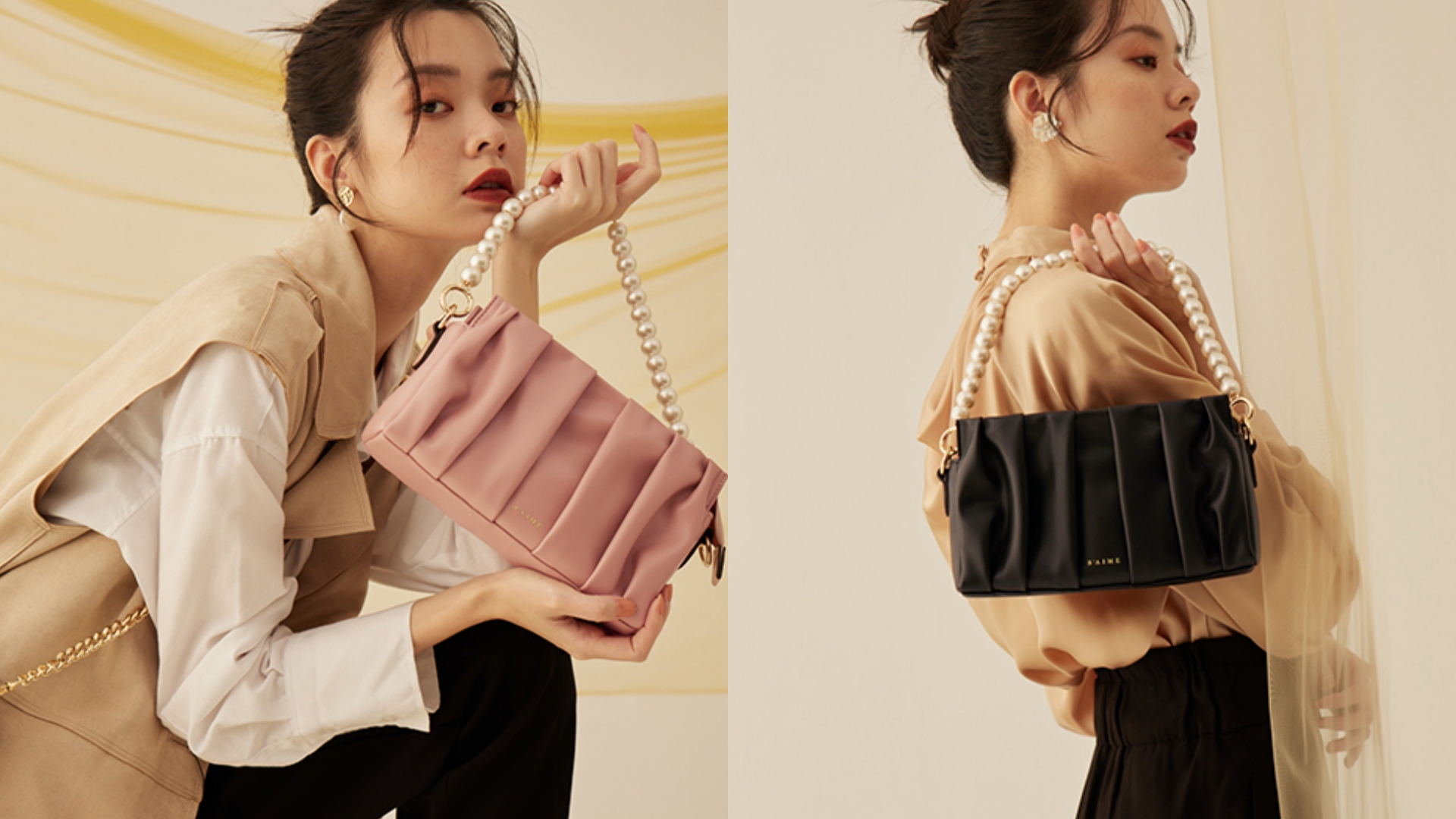 珍珠單品推薦 4:S’AIME 皺褶雲朵珍珠鍊條小方包