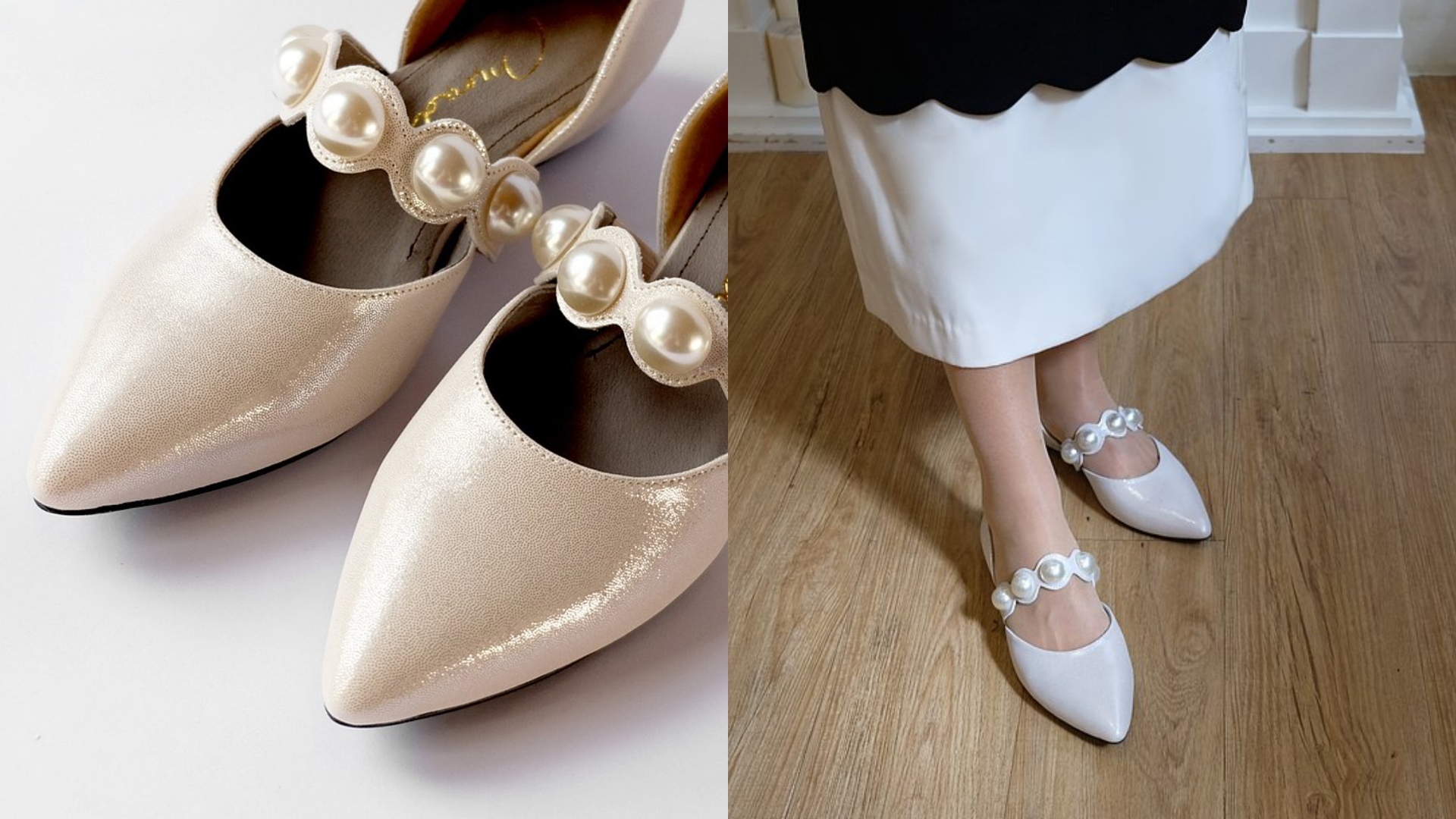 除了樂福鞋與高跟鞋,珍珠元素也與休閒的穆勒鞋非常搭,來自 Grace Gift 的這雙低跟鞋,不僅舒適好走也方便穿脫,復古的方頭造型與優雅的珍珠飾鍊,無論搭配褲裝或裙裝皆非常好看,一雙穿出率性風格。