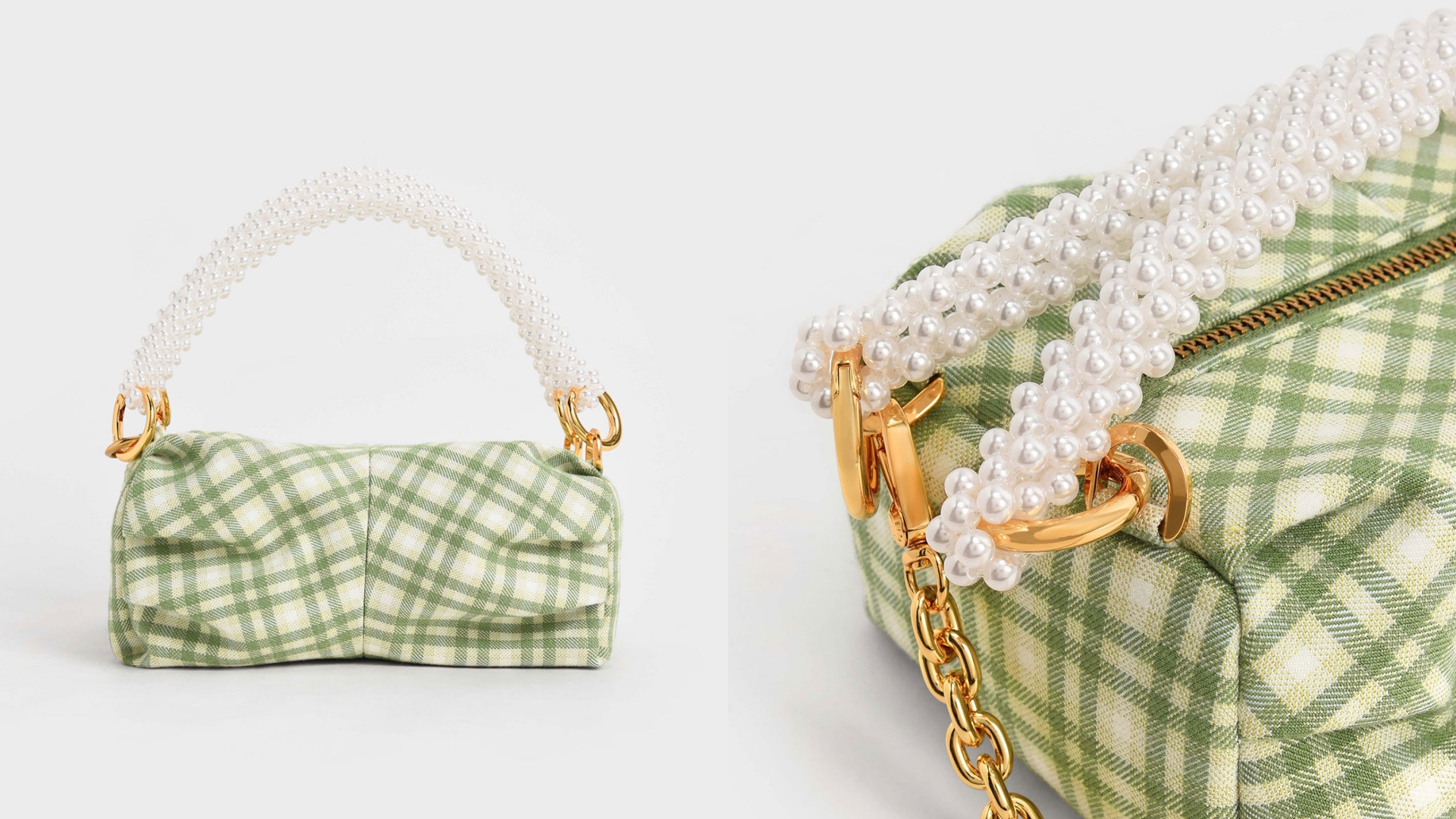 珍珠不僅能為穿搭帶來微奢感,若配搭如格紋這樣樸實的日常元素,也別具風格。CHARLES KEITH 這款綠格紋手提包,以抓皺設計凸顯包型立體度,搭配串珠短背帶,營造出優雅簡約的個性,拎著它出門,無論走到哪都能展現妳大氣的態度。