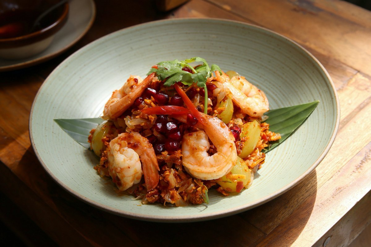 來到泰國當然要吃點涼拌的沙拉呀!除了常見的涼拌青木瓜,妞編輯特別要推大家點這道輕巧豐盛的「柚子蝦拌沙拉」,使用大隻鮮蝦拌細嫩柚子果肉,再加入烤椰子片、香蔥、碎花生、青檸葉、乾辣椒粉、綠葡萄等食材,最後點綴上寶石般的紅石榴,水果與海鮮之間的搭配恰到好處,酸香鮮甜清爽,是開胃的好夥伴。