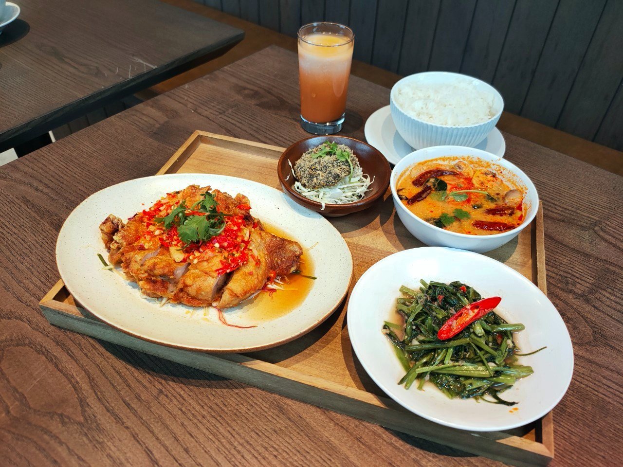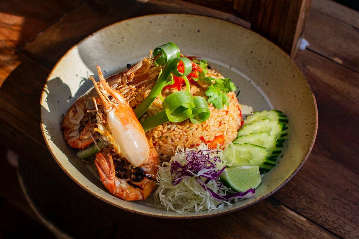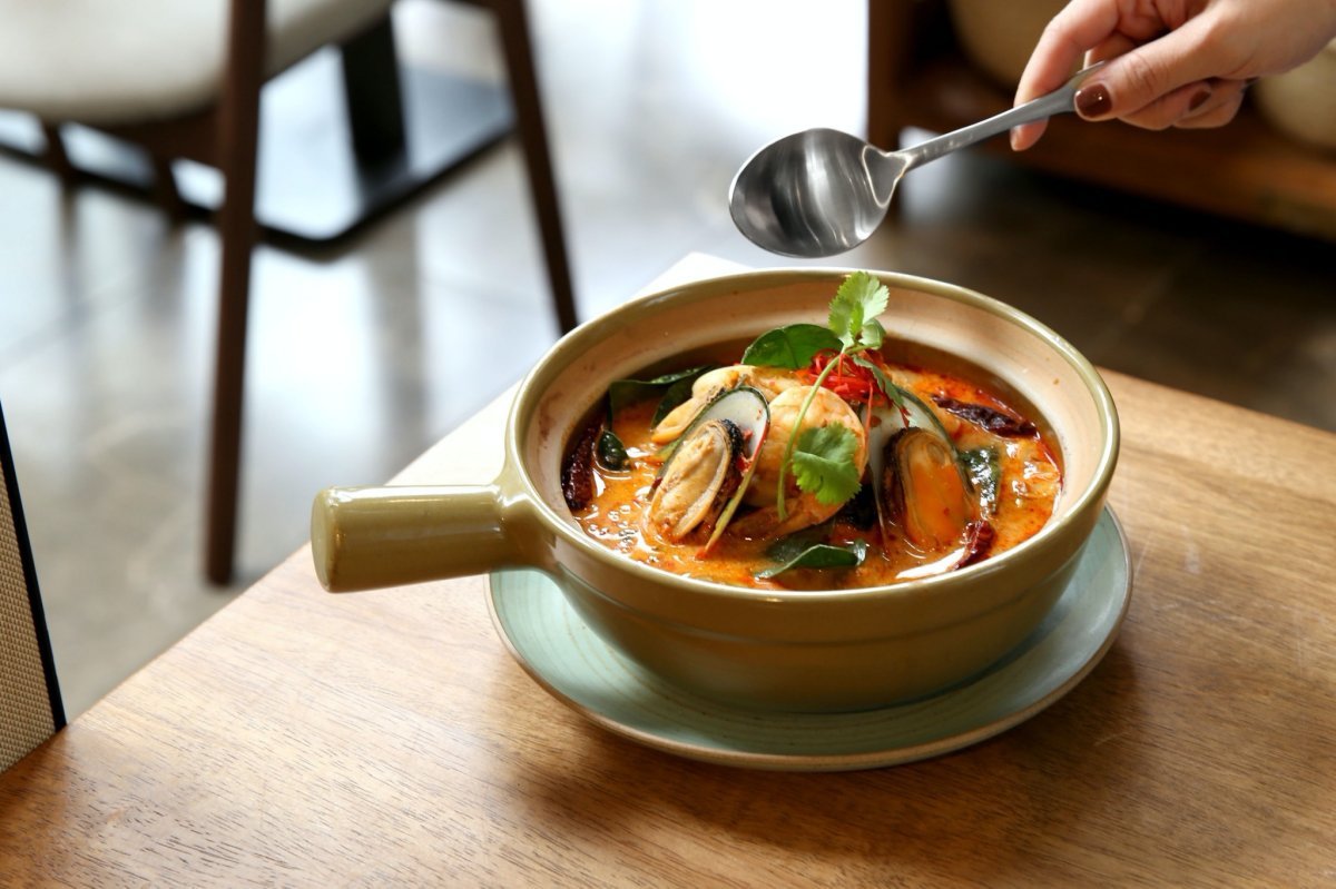 泰國名湯「冬蔭功」也是店裡必嚐美味(真的大推超好喝),酸香辣的完美融合,讓人喝一口就停不下來!而且為了更加呈現泰國實際的菜色滋味,店裡除了有提供「冬蔭功海鮮湯」之外,更學習曼谷常見的冬蔭功變化版,推出隱藏版菜單「冬蔭功炒飯」,米粒吸收蝦醬的濃郁海味,和香茅、南薑、檸檬葉、辣椒、青檸的獨特香氣,配上清爽的小黃瓜還能平衡味蕾呢。