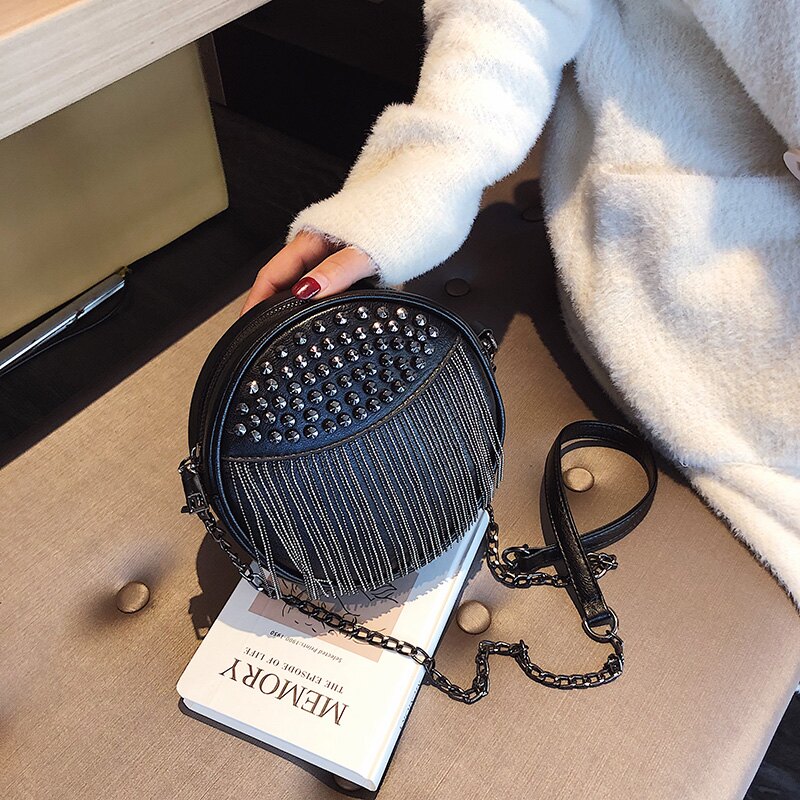 小圓包的造型,帶了點可愛又復古的感覺,加上流蘇造型,可說是復古風首選!喜歡強調個性感的姊妹,絕對要選有鉚釘的流蘇包!鉚釘讓流蘇小圓包更有個性感,中和掉圓包過於可愛的風格,展現出既可愛又有個性的那一面!