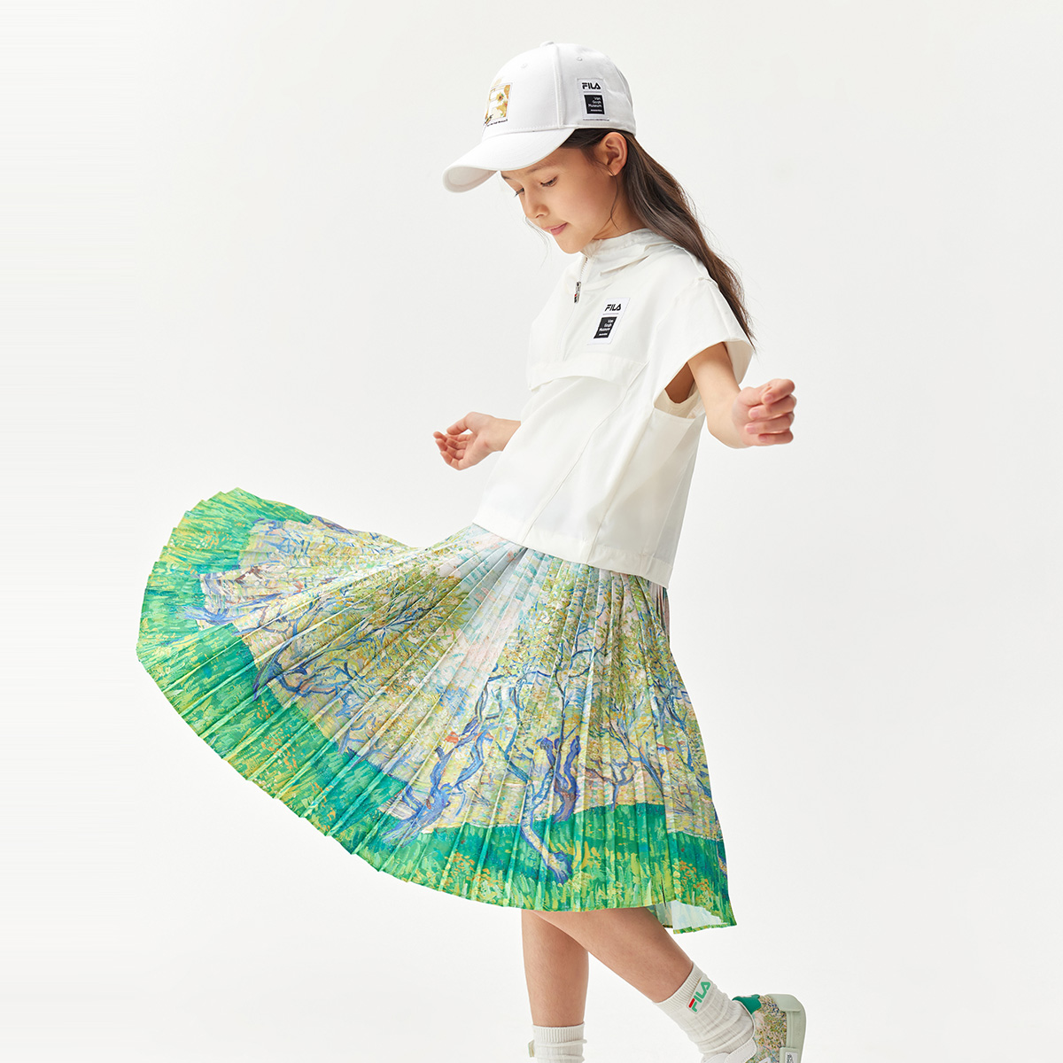 女童服飾則將蝴蝶袖上衣、連身百摺裙、休閒褲等化成梵高的畫布,印上《Orchard in Blossom》等名畫,一片春意盎然;連衣裙除了可單獨穿着、與連成一套的連帽短袖衞衣穿着,亦可配搭蝴蝶袖Tee或其他服飾,讓孩子發揮創意為自己打造百變造型,亦便於應對春天變幻莫測的天氣。