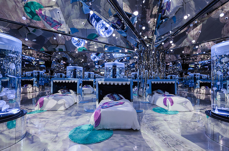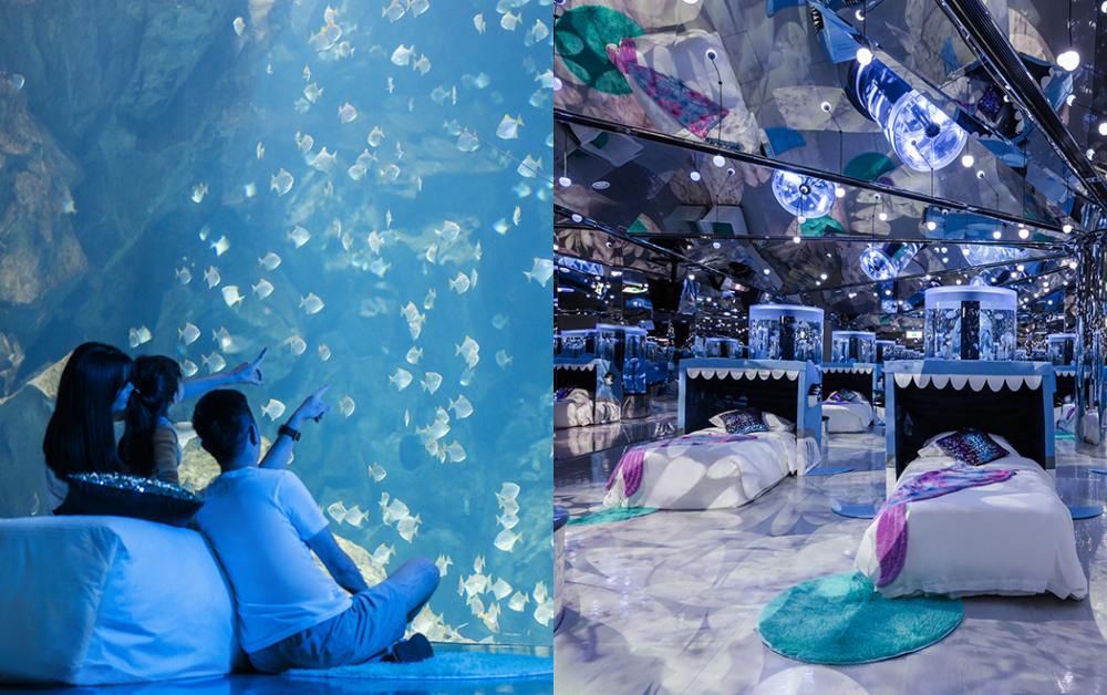 COZZI Blu斥資百萬打造業界唯一夜宿的獨家單人寢帳「宿曦小窩」,以鯊魚作為造型骨架,不僅具隔音及遮光等機能性,同時提供旅客隱私及安全感,特製模擬如漂浮在海平面情境結構的頂級單人床墊,彷彿漂浮在海平面上的愜意,搭配眼前一片蔚藍海底生物景致,一張開雙眼震撼的超巨大的水族缸就在眼前!