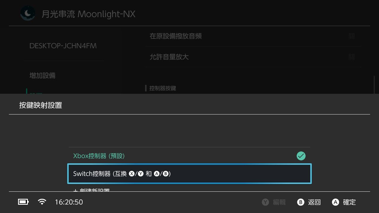 再來開啟串流插件Moonlight NX,先進入到設置把按鍵設定好,可以選擇使用Switch Pro把手(Xbox控制器),