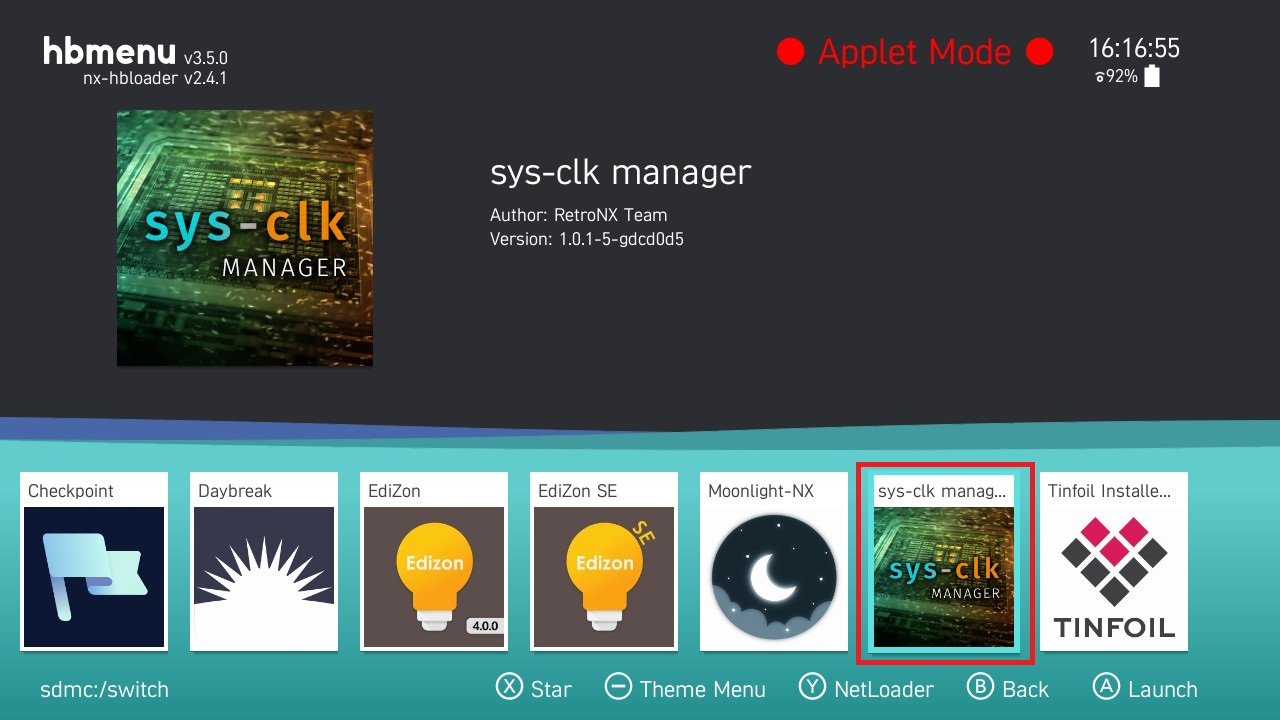 安裝完畢後進入相簿會看到串流插件Moonlight NX,及超頻程式sys-clk-manager,開啟sys-clk-manager超頻程式。