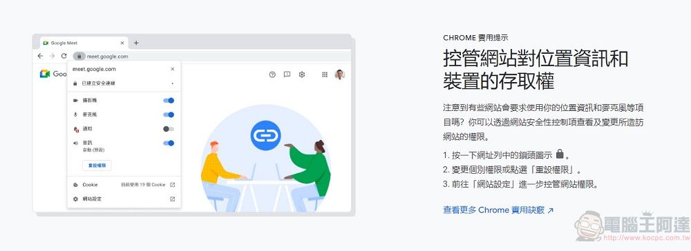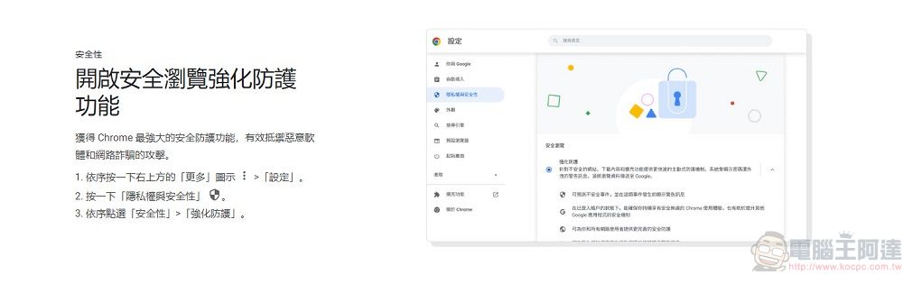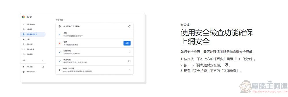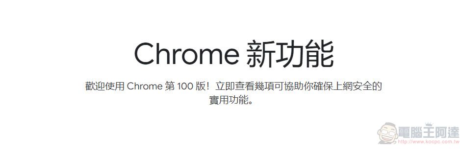 更新完成後會跳出歡迎使用的頁面,並介紹「使用安全檢查功能確保上網安全」、「開啟安全瀏覽強化防護功能」、「控管網站對位置資訊和裝置的存取權」等安全資訊。