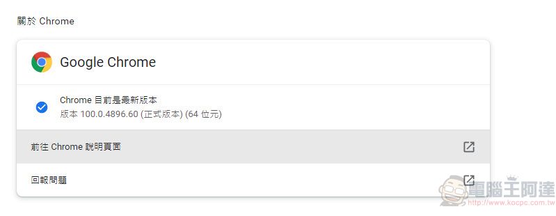 想要確定自己的Chrome瀏覽器是否已更新到100版,可以在設定中的關於 Chrome做確認,如果是之前的版本也會自動更新。