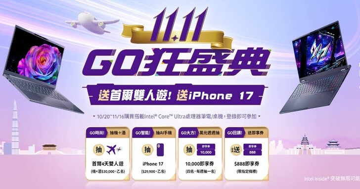 Acer 雙11購物節開跑!多款AI PC與電競筆電祭出優惠,購買指定AI PC有機會抽中首爾雙人遊,電競筆電更享高額回饋,快來選購你的夢幻AI PC!Acer 迎接年度最大購物盛事「雙11購物節」,推出橫跨 AI PC 與電競筆電的重磅促銷活動,並祭出多項好禮,包含「首爾4天雙人自由行」、最新「iPhone 17」、萬元即享券等,並首度跨界與「2025 AAA 亞洲明星盛典及 ACON 音...