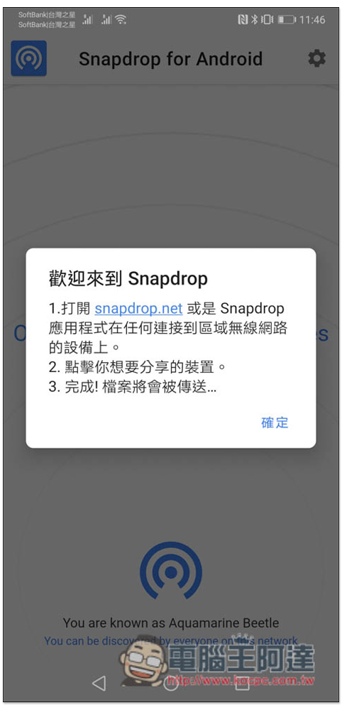 打開 Snapdrop App 後,首次會跳出這訊息,有繁體中文語系,所以操作上應該不是問題,記得只有在同個無線網路底下才能傳輸檔案: