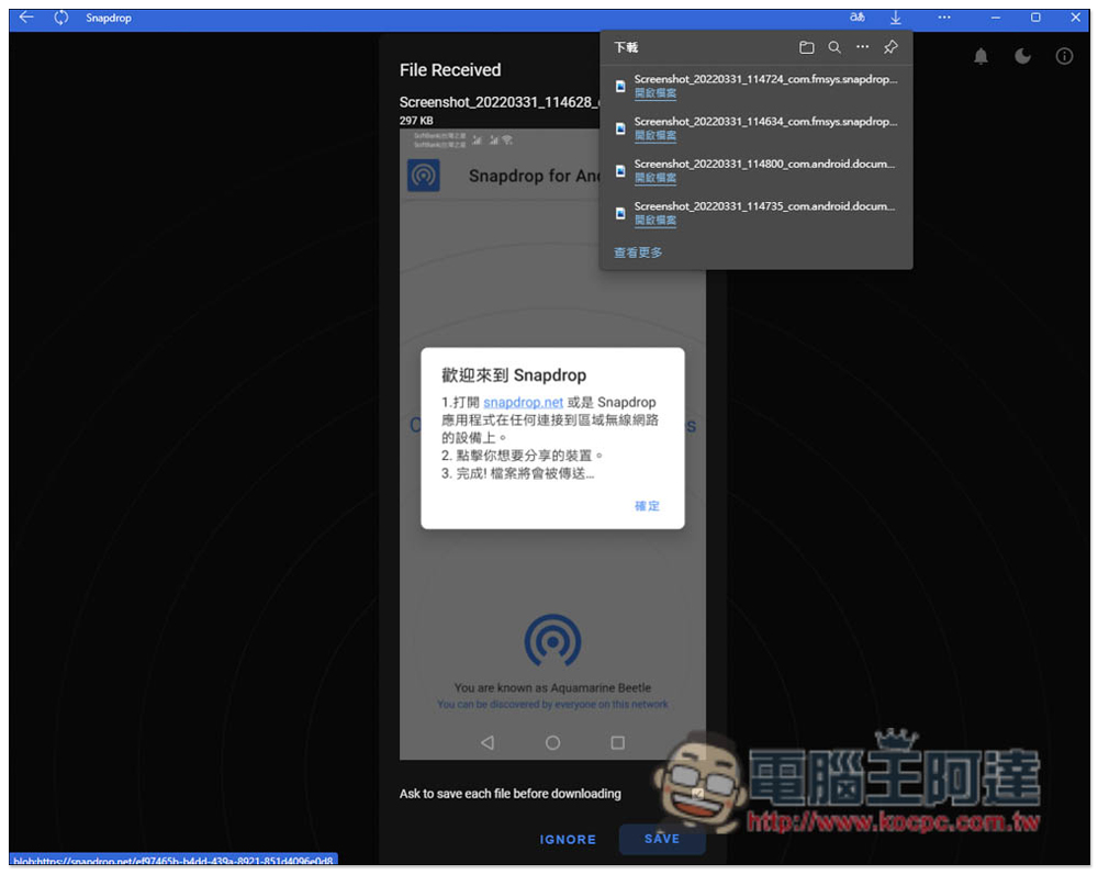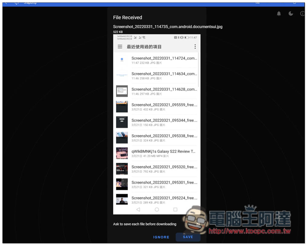 電腦端也會跳出接收到檔案的訊息畫面,沒問題就按下方 SAVE 儲存,不想接收則點擊 IGNORE 忽略: