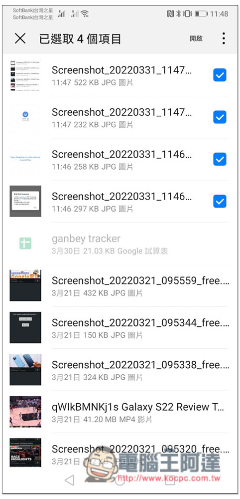 右邊就會出現打勾的圖示,這時即可選取其他你想一併傳送的檔案、照片,選好後按右上角開啟,就會開始傳輸:
