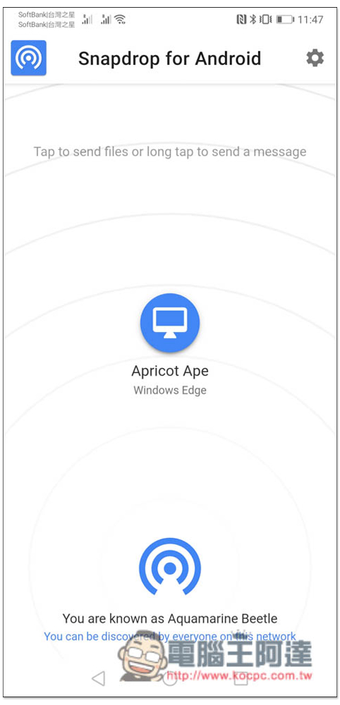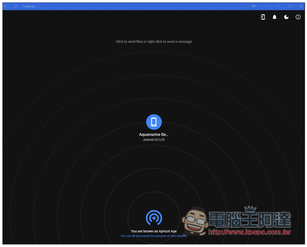 接著就會進到這熟悉的畫面,如果你已經打開 Windows 版的 Snapdrop,那畫面應該就會出現你的電腦設備: