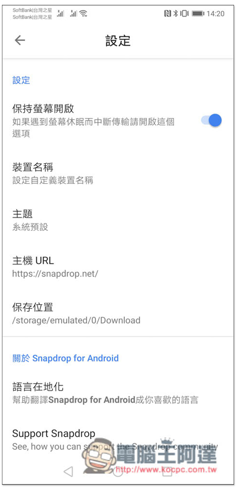 設定中還有一些選項可以調整,像是保持螢幕開啟、裝置名稱、主題、保存位置等等: