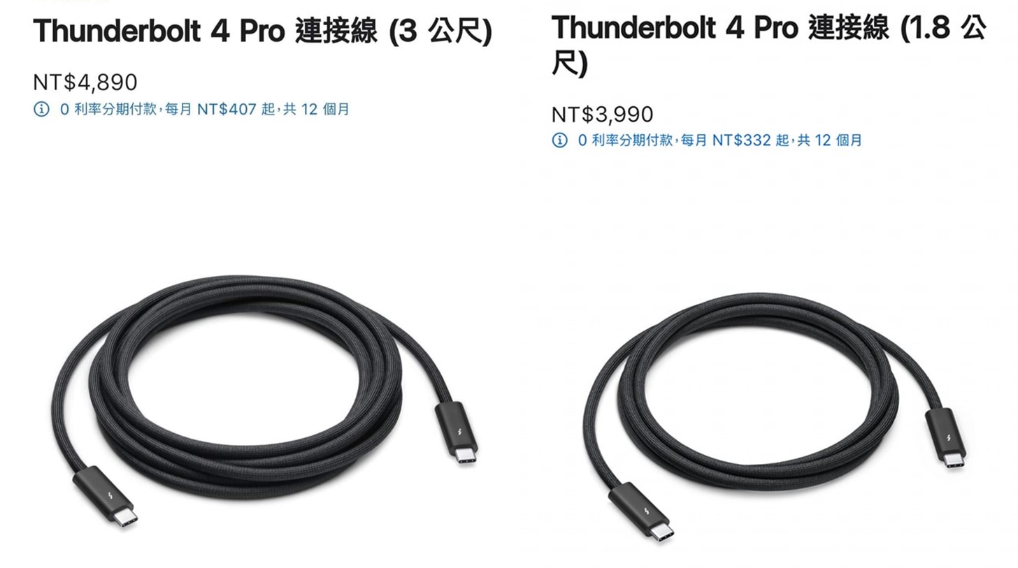 Apple Thunderbolt 4 Pro連接線長度為3公尺與1.8公尺,3公尺的建議售價為$4890,1.8公尺為$3990。