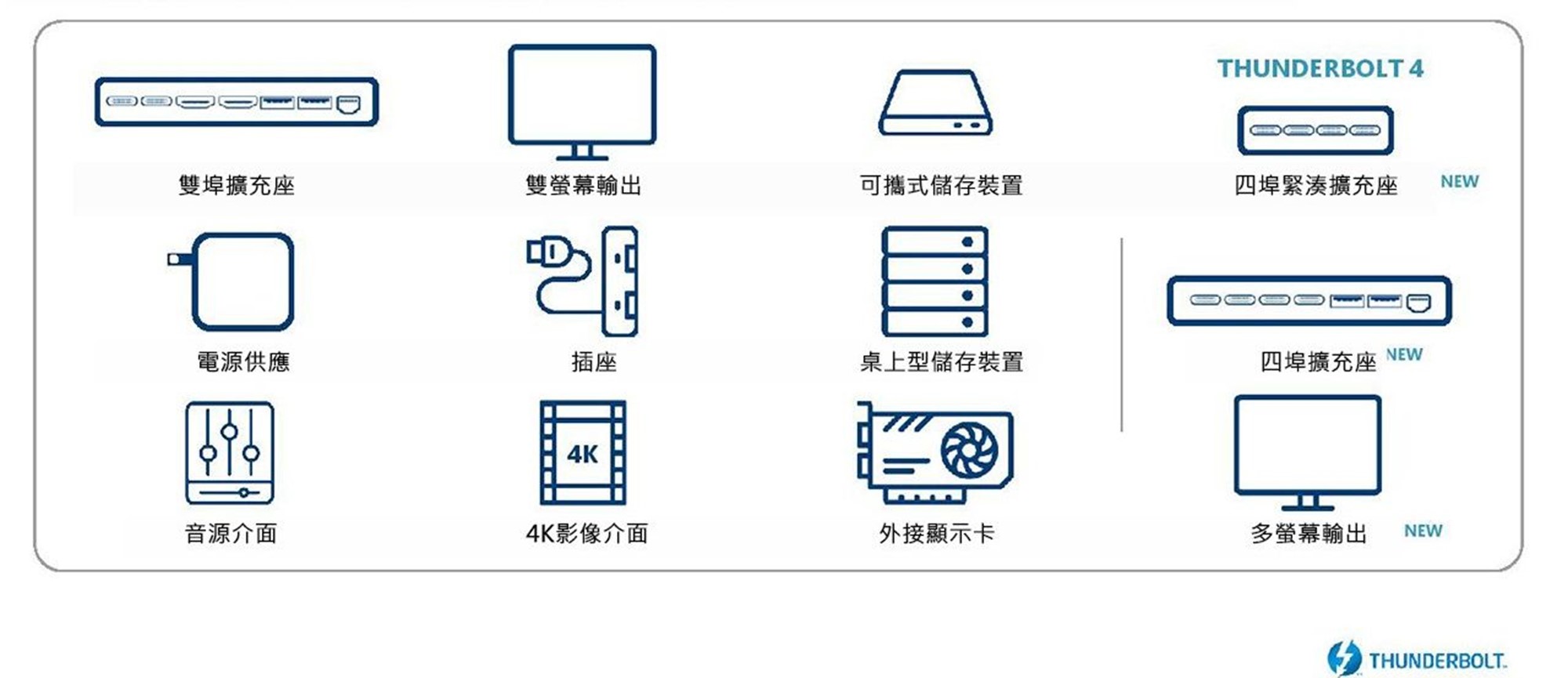 Thunderbolt 4(雷電4)是Thunderbolt™ 最新第四代技術,具備高速資料傳輸、輸出影片訊號並且可以同時向相容的裝置供電,具有 40 Gbps(每秒千兆位)的雙向頻寬並可以連接多達五個 Thunderbolt 裝置,可與許多連線標準相容,包括早期版本的 Thunderbolt™、USB、DisplayPort 和 PCle。Thunderbolt 4目前在配備第 11 代 Intel® Core™ 筆記型處理器的電腦或配備 Thunderbolt 4 控制器的系統上可以找到連接埠。
