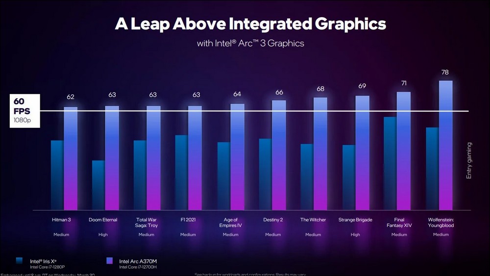 發表會上 Intel 展示最低階 Arc 3 筆電獨顯的遊戲效能實測,10 款大作都能提供 60FPS 以上:
