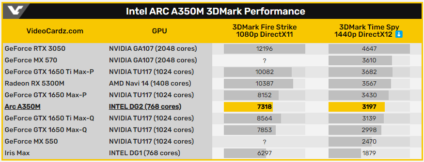 更清楚的分數比較,可以參考下方外媒 VideoCardz 的整理表格,Arc 350 就跟 GeForce GTX 1650 系列差不多,特別值得一看的是 3DMark Time Spy 1440p DirectX 12 這一樣,分數只輸最高階的 GTX 16050 Ti Max-P 一點點,由此可見 Intel 在發表會中強調 Arc 系列是為 DirectX 12 設計這點是真的: