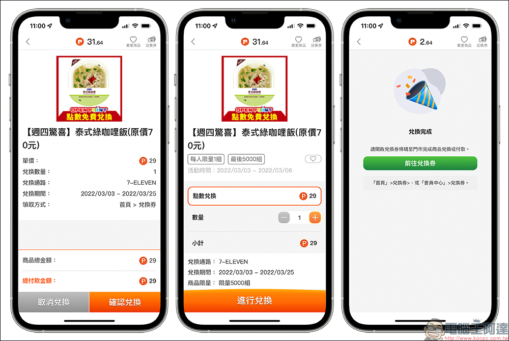 於 OPEN POINT App 成功用點數兌換後,除了會立即扣除 OPEN POINT 點數,兌換之商品也會轉換為指定的商品兌換券形式,讓會員可以在方便的時候再前往領取。