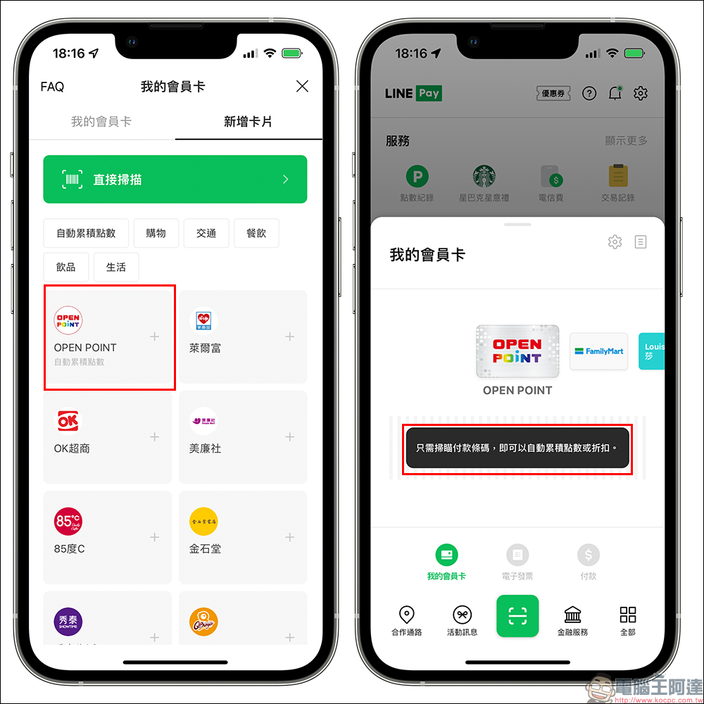除了能用 OPEN POINT App 出示條碼累積 OPEN POINT 點數,如果有在使用 LINE Pay 支付的朋友們,也可在 LINE Pay App 綁定 OPEN POINT 會員卡,結帳時只需掃瞄付款條碼,即可自動累積點數。