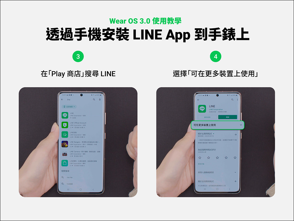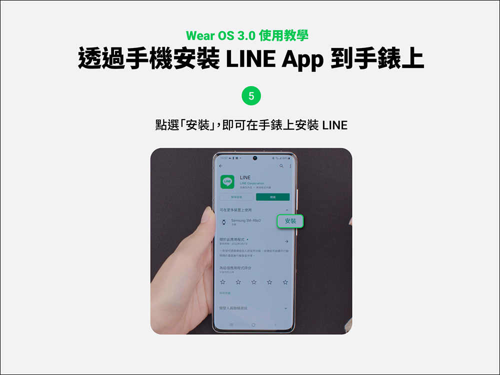 接著點選「安裝」即可在 Wear OS 3.0 系統的智慧手錶上安裝 LINE App 。