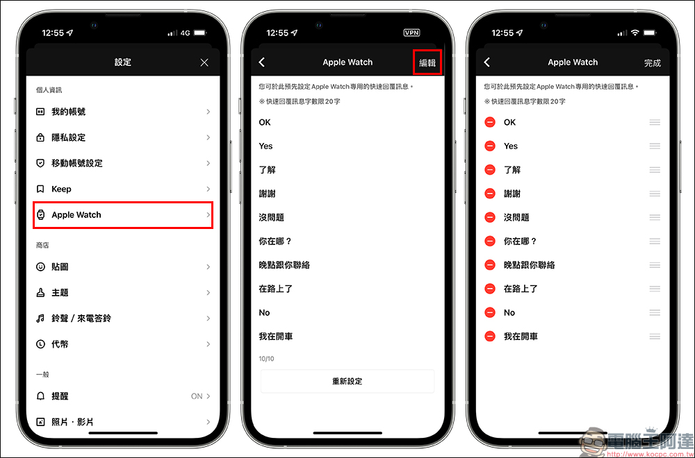 自訂快速回覆訊息的內容可在手機 LINE App 設定內進行編輯,依序點選「設定」>「Apple Watch」即可編輯多組快速回覆訊息內容。