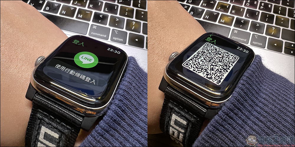 接著在 Apple Watch 開啟 LINE App 並點選「使用行動條碼」,接著拿出 iPhone 掃描行動條碼。