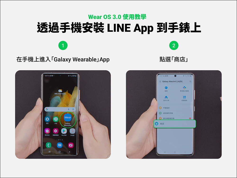 現在起也能使用 Wear OS 3.0 系統的智慧手錶使用 LINE 囉!在使用前一樣先確認手機已安裝 LINE App ,接著打開手機找到 Galaxy Waerable App 、點選「商店」。(*這裡 LINE 官方以 Galaxy Watch 為範例)