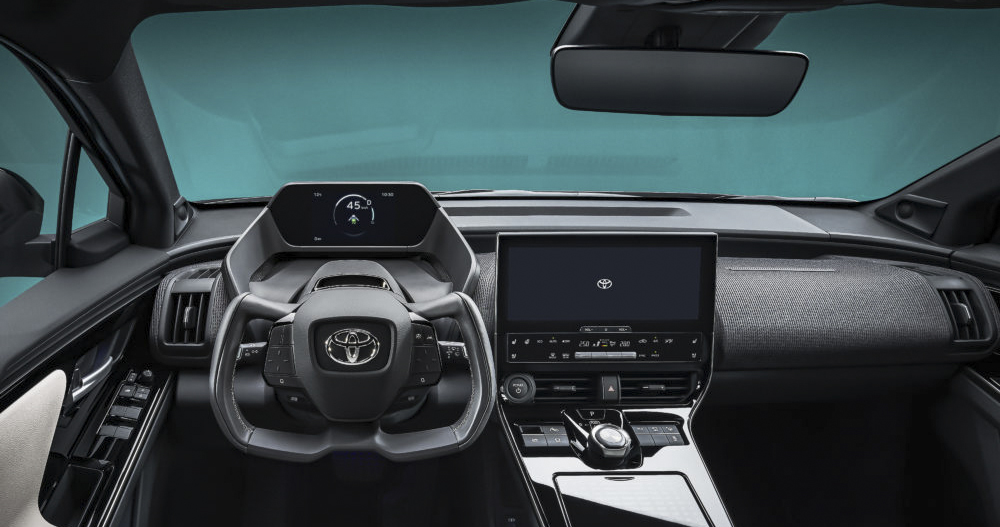[caption id="attachment_434762" align="alignnone" width="1000"]先前,Tesla CEO 曾透露採用 Yoke 異形方向盤的原因之一,就是希望能保證儀表板的視野。到了 Toyota BZ4x 概念車款上,他們則是提到之所以會在非賽車車款使用非圓形方向盤的原因,除了也希望保障視野外,另一方面則是因為採用電子化的線控轉向系統的關係,得以透過較小的轉向比來讓駕駛可以在不須轉動太多圈數的前提下,進行低速的方向盤大幅度操控;高速時可以順應提升轉向比來保障操控的穩定性與細膩度。