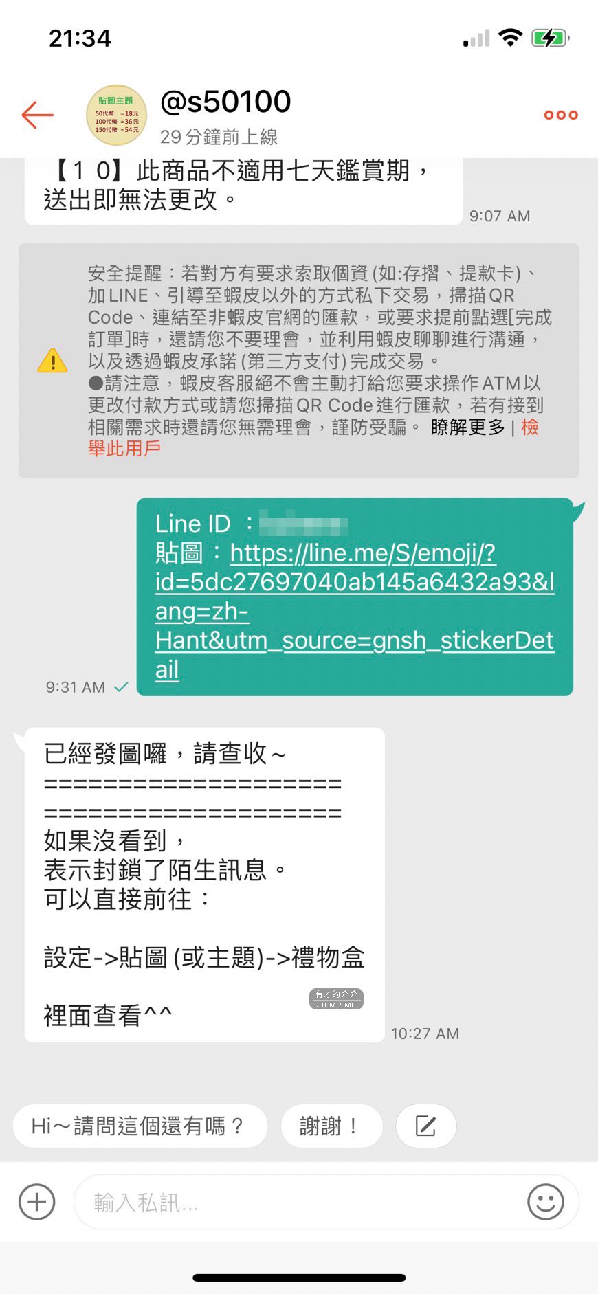 接著店家就會去加你 Line 好友,並且將你挑選的貼圖用「贈送」的方式送給你,這樣就能用18塊超低價的方式買貼圖了,有興趣的可以自己在蝦皮賣場搜尋 Line貼圖,就有機會買到便宜的貼圖。