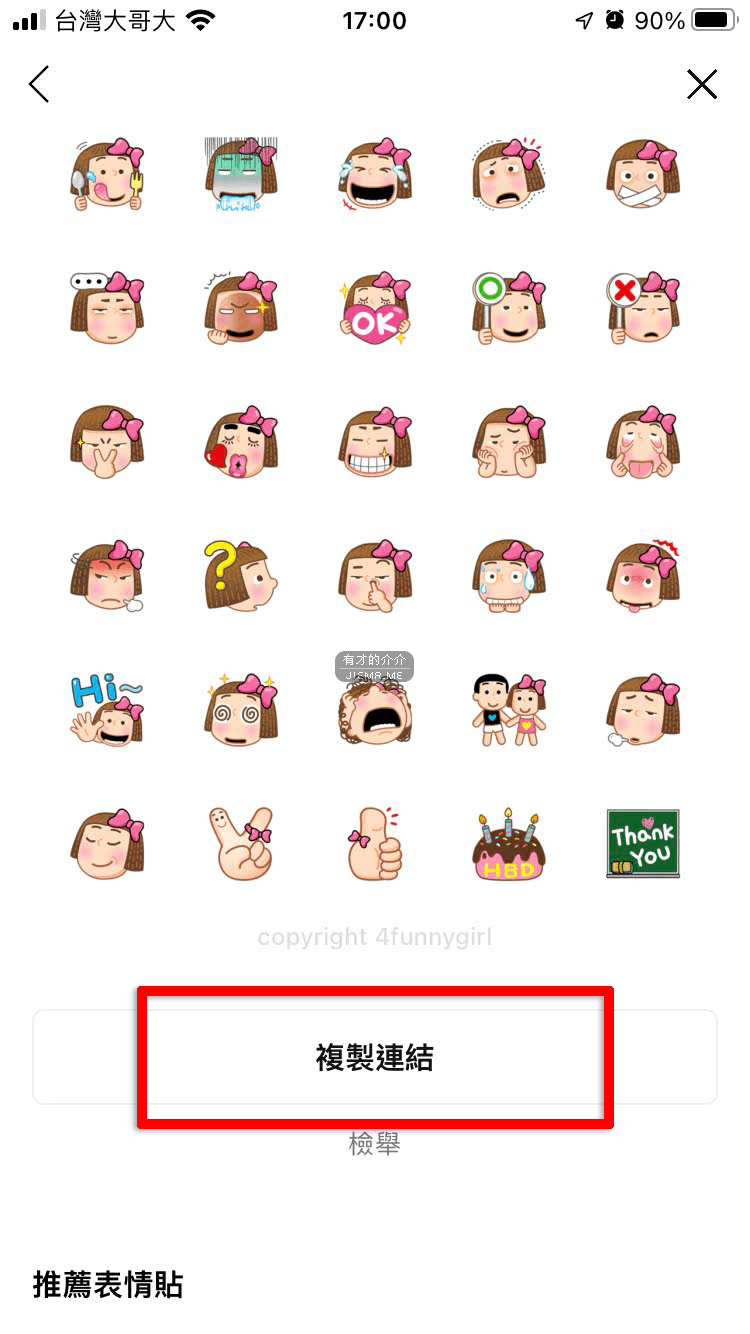 打開手機的 Line App 接著選主頁 >貼圖小舖 中挑選想要的貼圖或主題,接著滑到下面的「複製連結」將連結記錄下來,等下要傳給賣家。