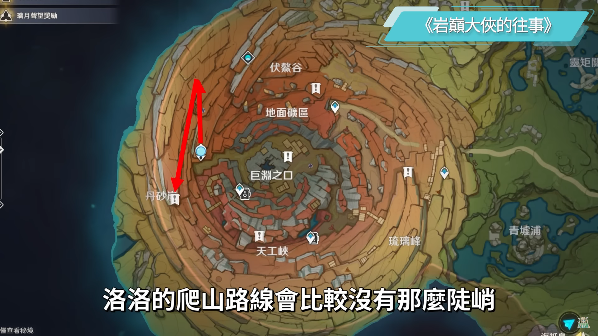 岩巔大俠的往事需要我們到層岩巨淵地表的最高處來接取這個世界任務,可以先從七天神像傳送過來,此外也建議可以參考洛洛的爬山路線會比較沒有那麼陡峭。