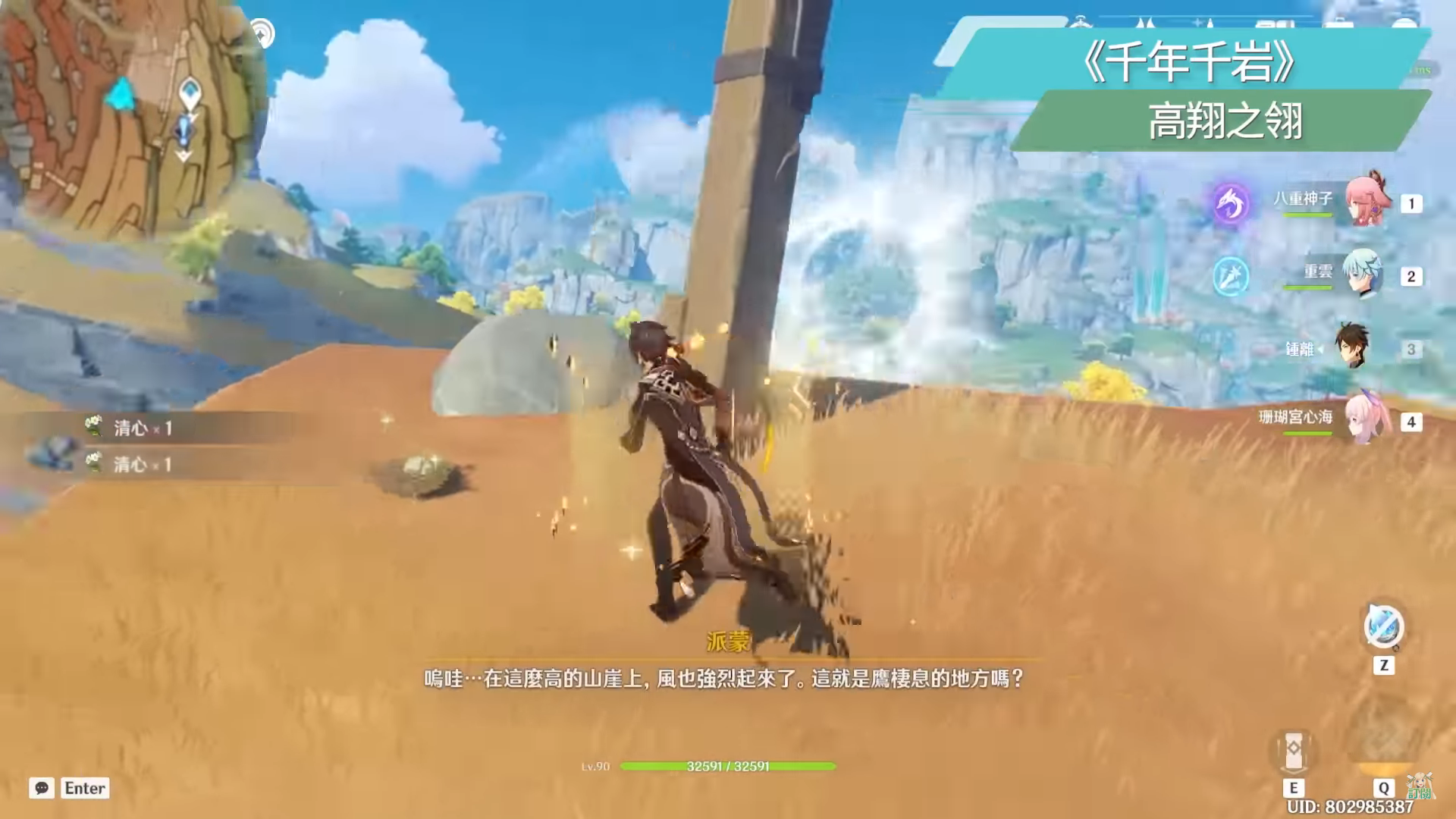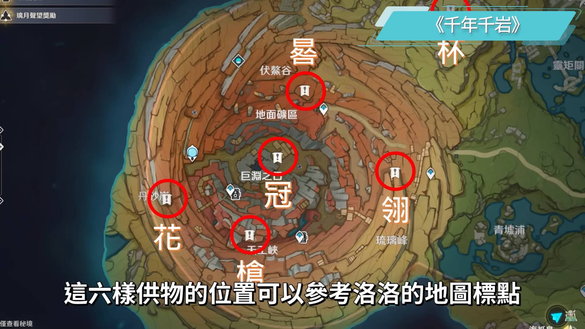 最後是關於千年千岩的世界任務,我們可以從巨淵之口的傳送錨點來附近找到NPC阿望,任務流程主要是我們去找回一名幫助礦工的千岩軍的六樣相關供物,分別是「庇佑之冠」、「共飲之杯」、「高翔之翎」、「同澤之槍」、「遠眺之花」、「歲時之晷」。這六樣供物的位置可以參考洛洛的地圖標點,其中兩個供物「共飲之杯」和「遠眺之花」我們已經在前兩個任務中拿到了,因此剩下四個。
