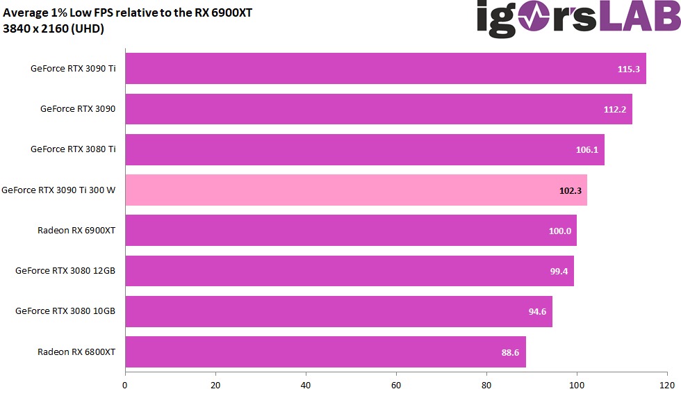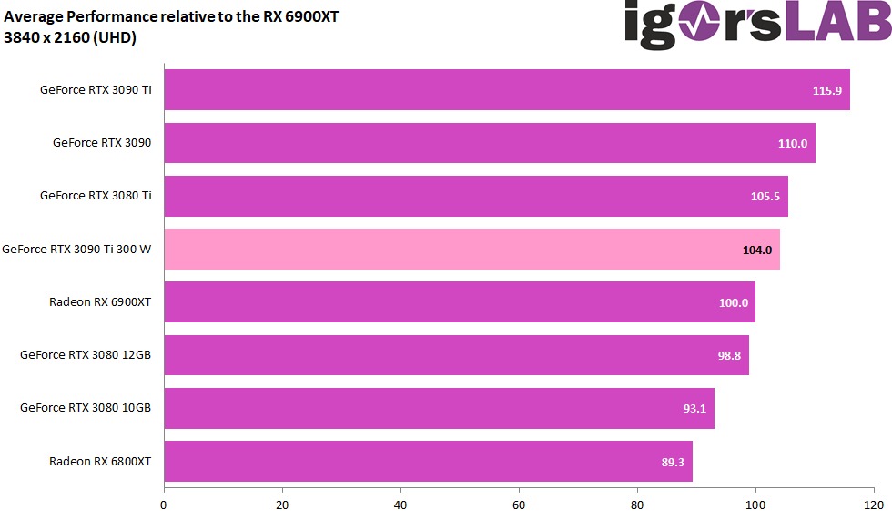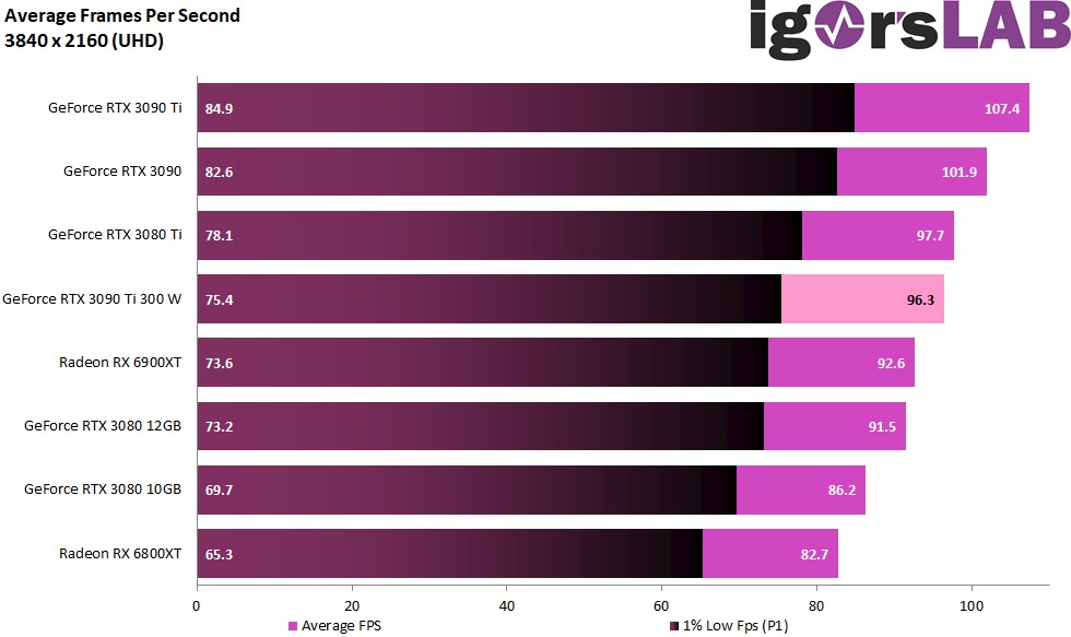 可以看到,GeForce RTX 3090 Ti 300W 的平均 FPS 為 96.3,幾乎就跟 GeForce RTX 3080 Ti 表現一樣,而 RTX 3080 Ti 的 TGP 為 350W,意味著 RTX 3090 Ti 只需要用 300W 就能達到這個水準,競爭對手 AMD RX 6900XT 則是已經贏過,輕輕鬆鬆就擊敗: