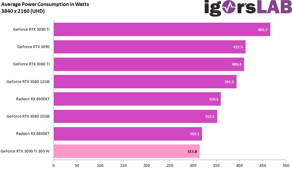 平均功耗表現,RTX 3090 Ti 300W 僅 313.8,比其他高端顯卡都還要低,還比 Radeon RX 6800 XT 低 6%,但效能卻快了 12%: