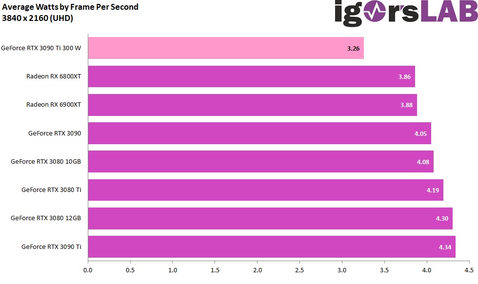 平均功耗跟 FPS 換算之後,RTX 3090 Ti 300W 為 3.26,是所有當中最低: