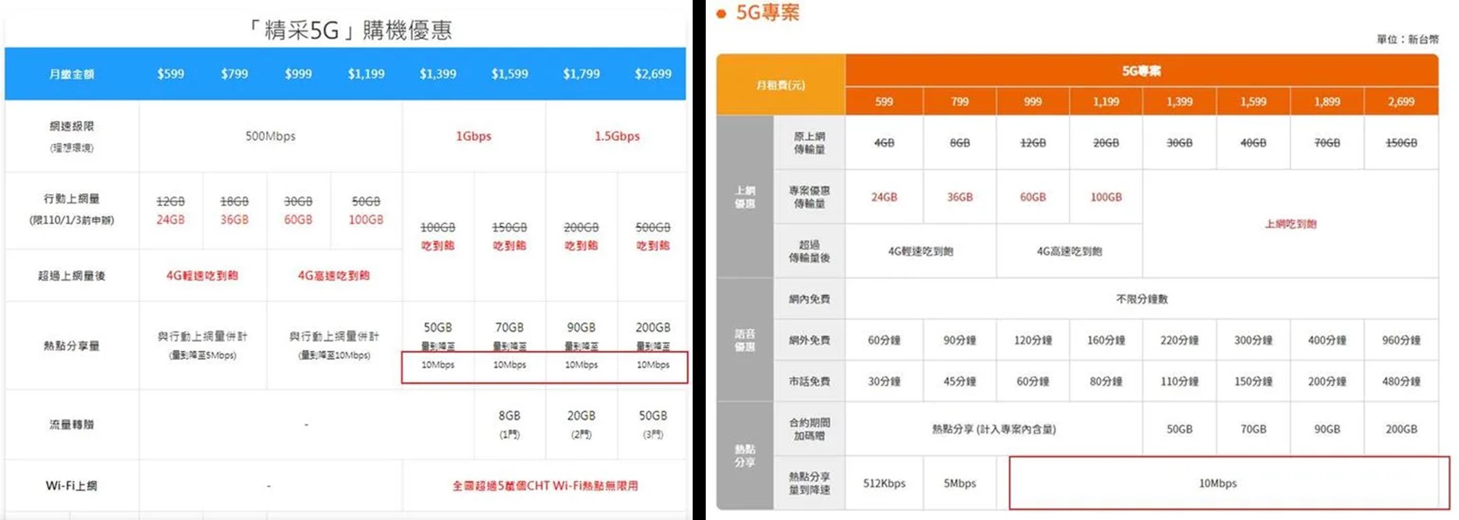 相較於4G資費,台灣5G資費增加了熱點分享超量降速的設計,申辦5G 999以上資費熱點分享超量後將會被降速至10Mbps,599~799資費則依業者不同降速到512Kbps~5Mbps。