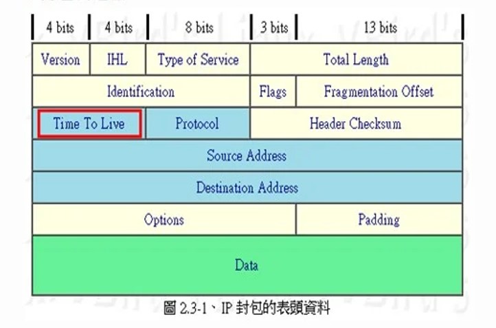 TTL (Time To Live),其值代表還有多少「生存時間」,代表還可以被轉發處理多少次。每個路由器在轉發 ICMP 封包時,都會把 IP Header 的 TTL值會減1,如果 TTL值已經到0,就代表 TTL 已經到期,接著就會傳送錯誤訊息給原本發送的網路設備,電信業者可以透過偵測TTL數值來判斷用戶透過熱點分享使用多數行動數據。